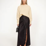 Nederdelen skiller sig ud med sin luksuriøse satin og vintage-inspirerede blondedetaljer.