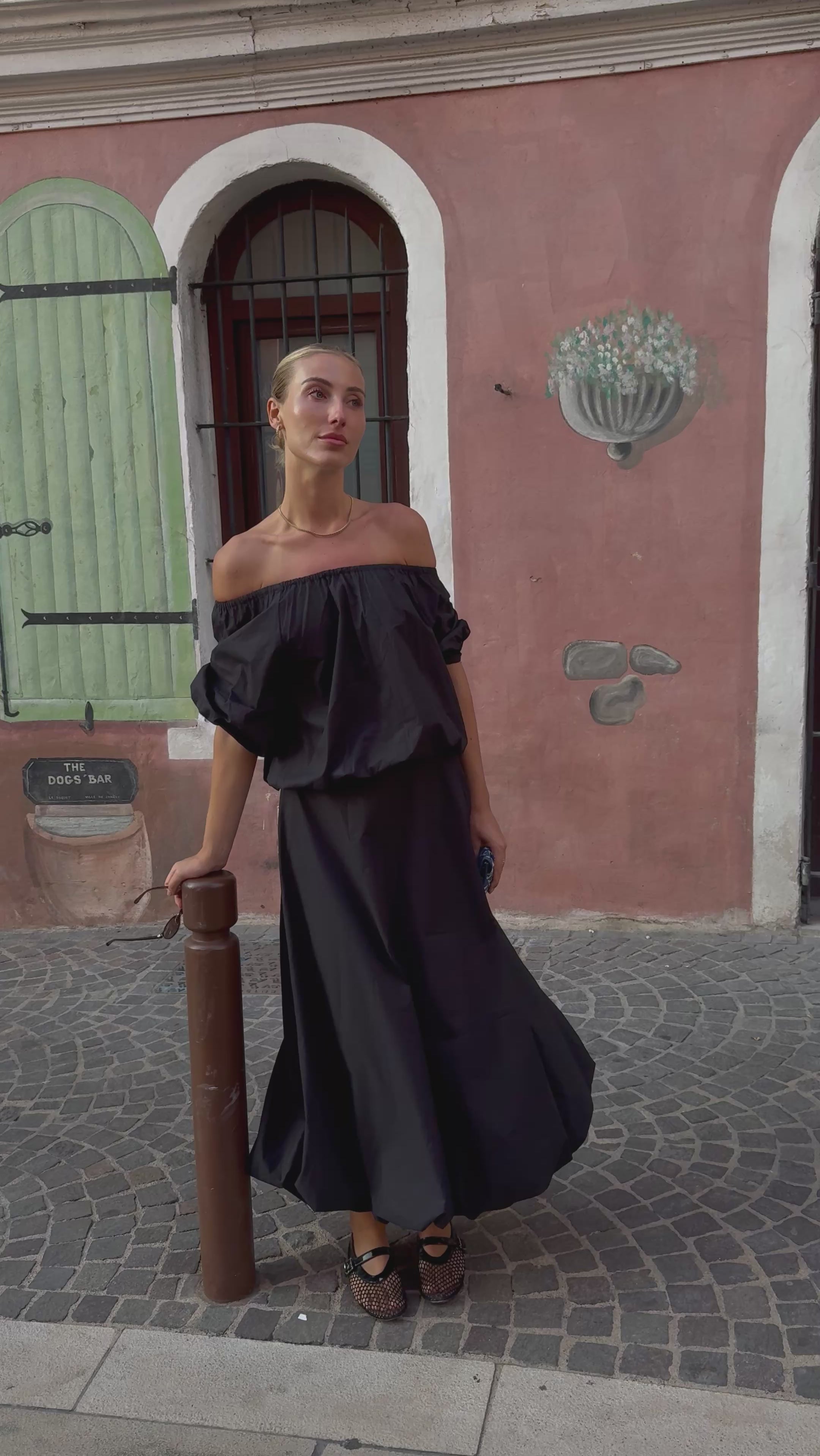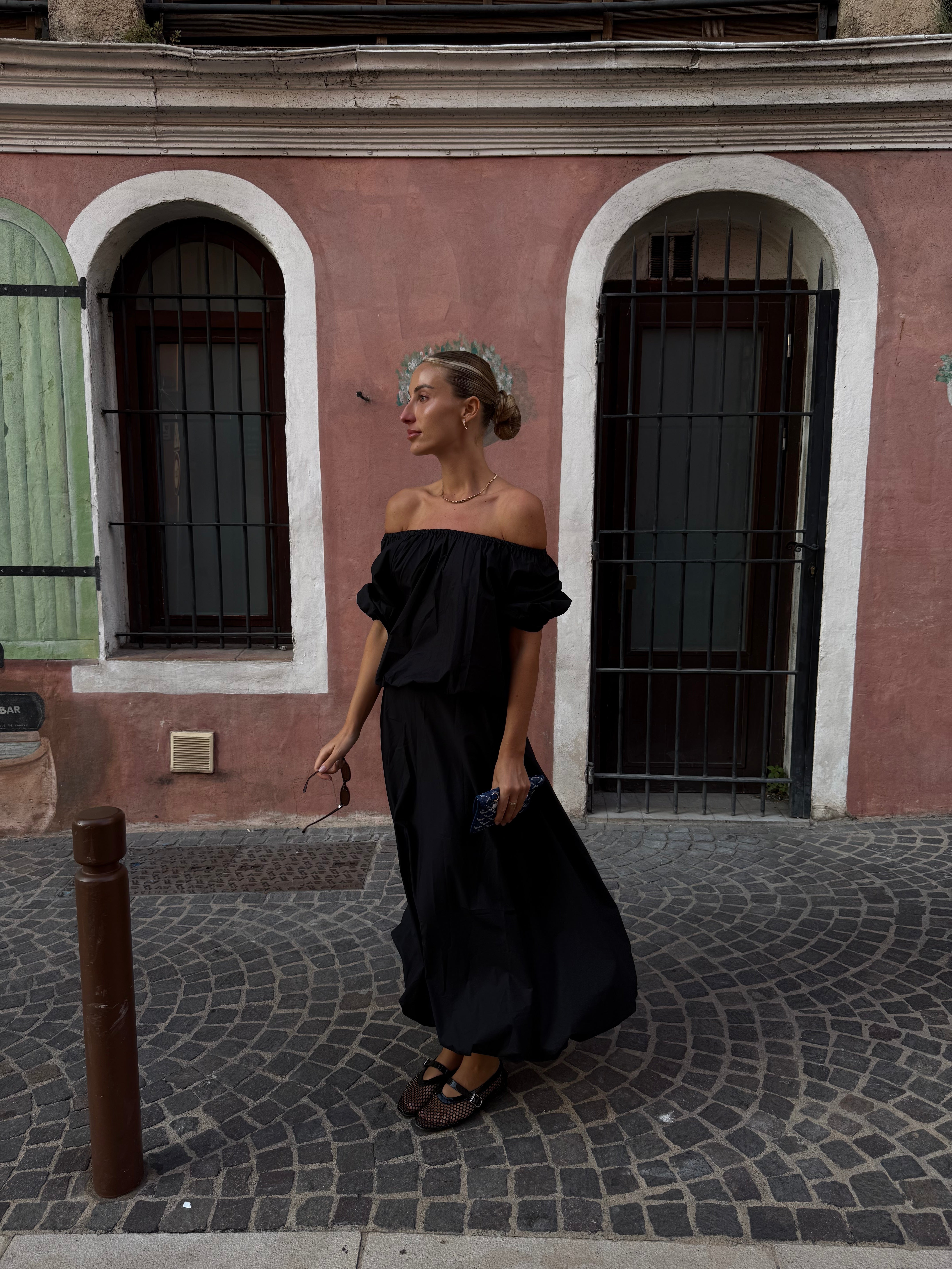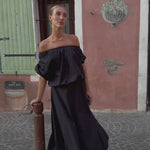 Elastikdetaljer i manchetter, hals og søm giver mulighed for styling både med og uden skuldre – afhængigt af humør og anledning.