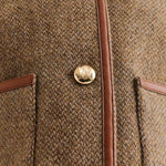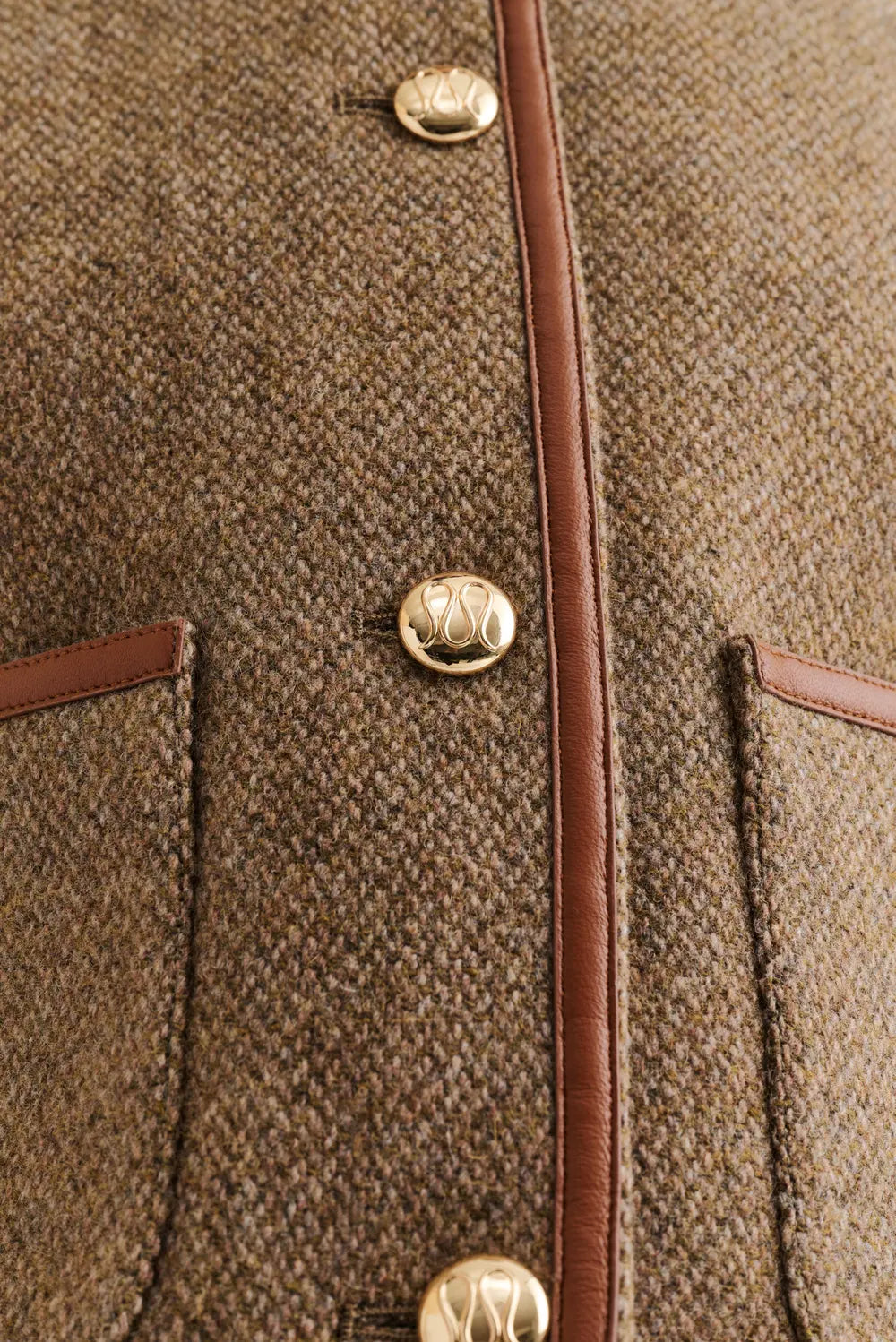 Skræddersyet jakke i uldtweed med læderkant, to forlommer og guldfarvede knapper