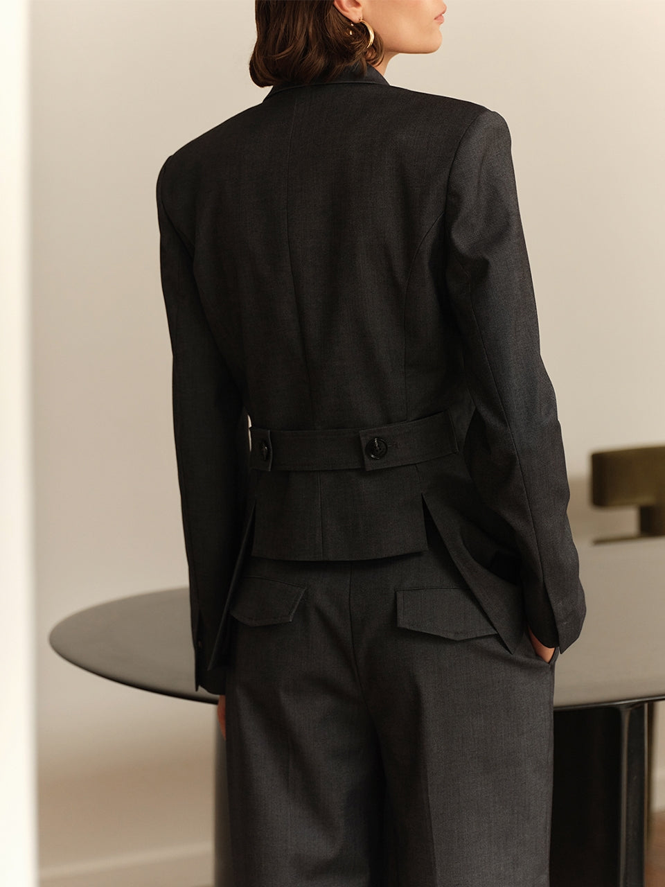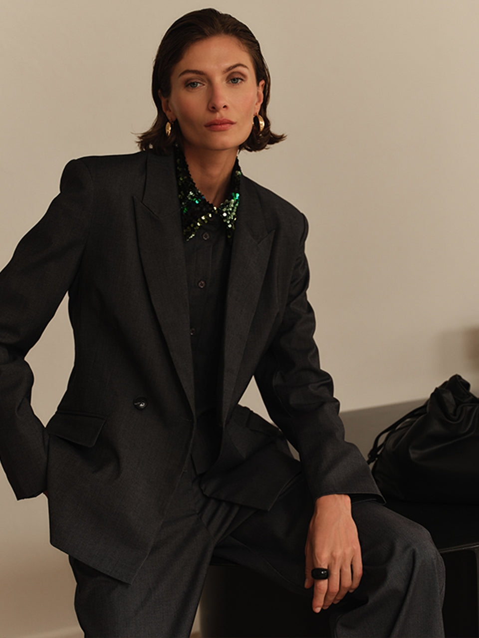 En god power-blazer er et must, og Acelyn er lige præcis det. Med markerede skuldre, taljeret pasform og diskret meleret stof får du et moderne og sofistikeret look. Brug den med de matchende Gomo-bukser for et stilrent sæt.