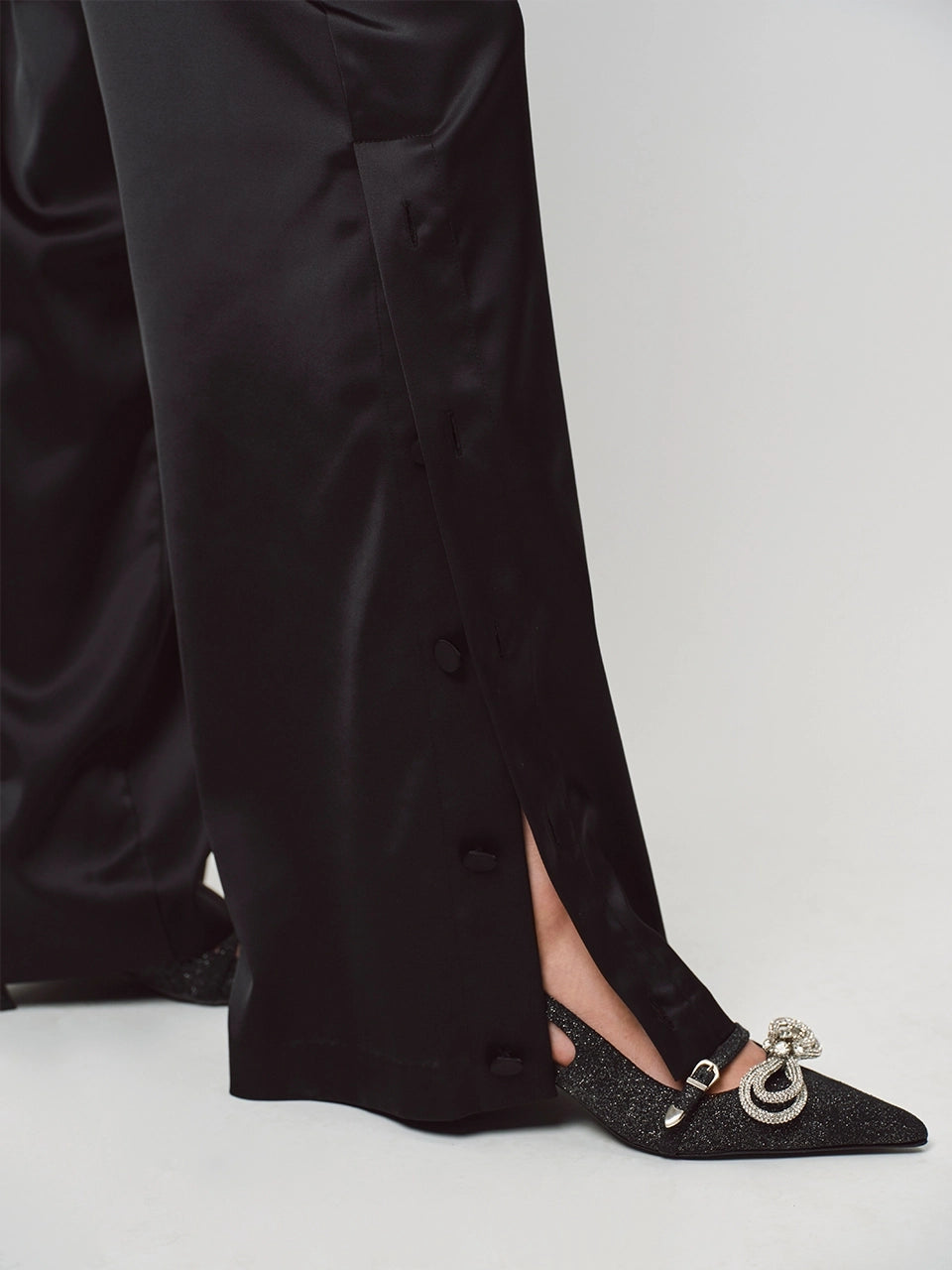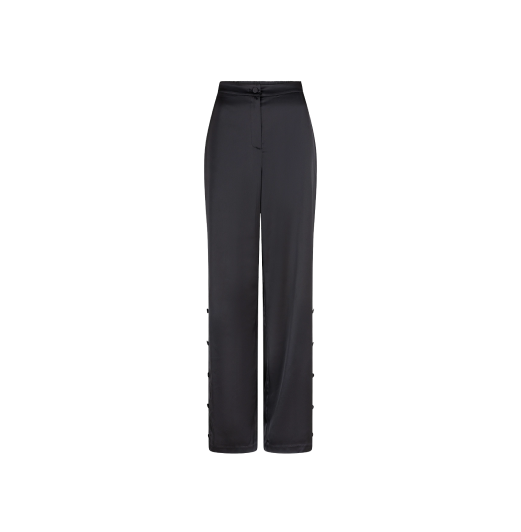 Adriël-bukserne i sort er vores friske bud på vide satinbukser. De har knapper dækket med skalskud langs den nedre sidesøm og en elastisk talje bagpå. Bukserne er lavet af en certificeret genanvendt polyesterblanding.