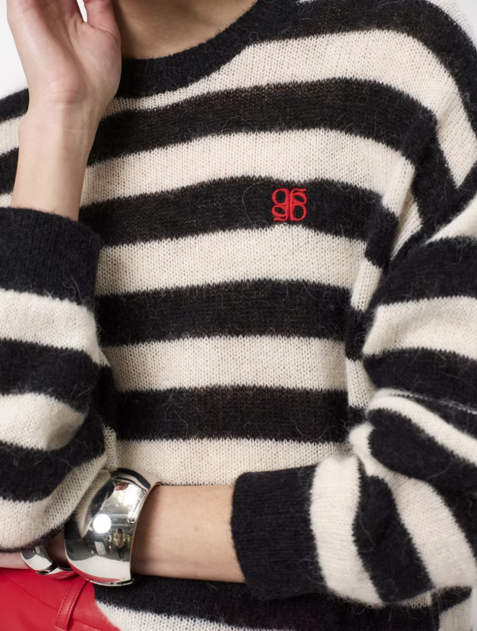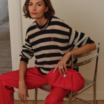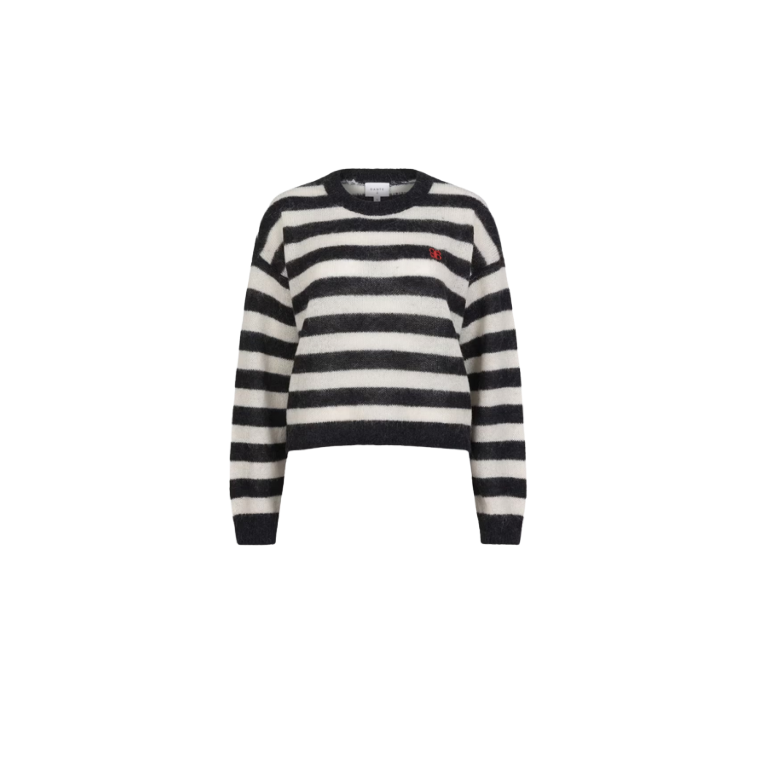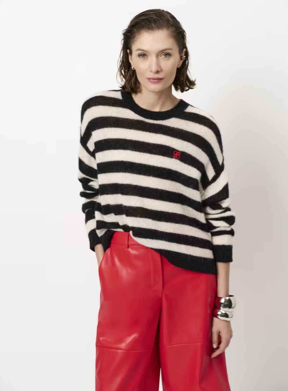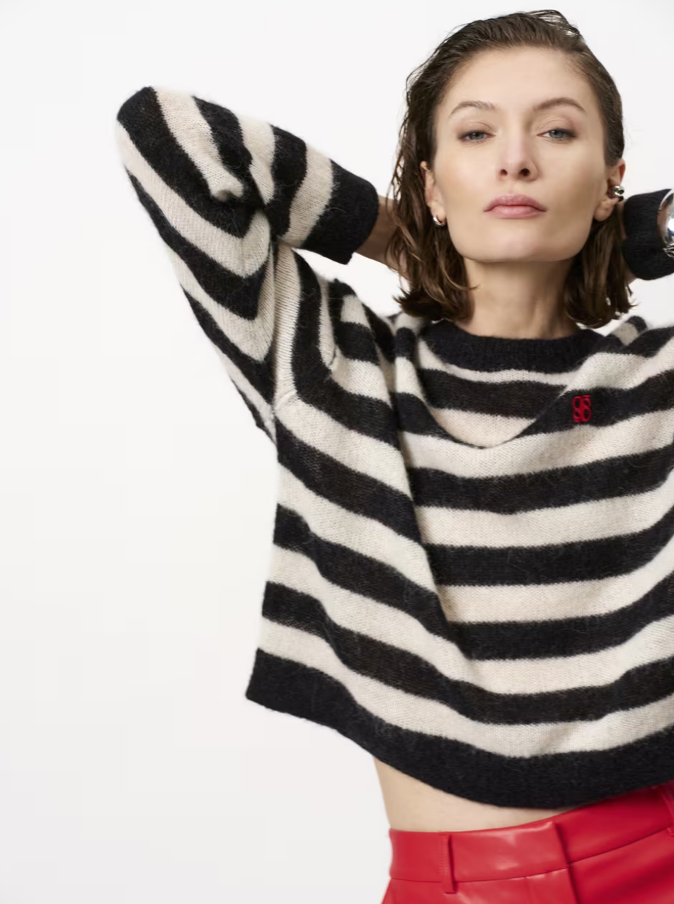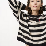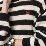 Ariama sweateren i sort og creme er perfekt til hverdagen. Den er strikket i en let alpaka-uldblanding med rund hals, droppede skuldre og et lille rødt logo foran.