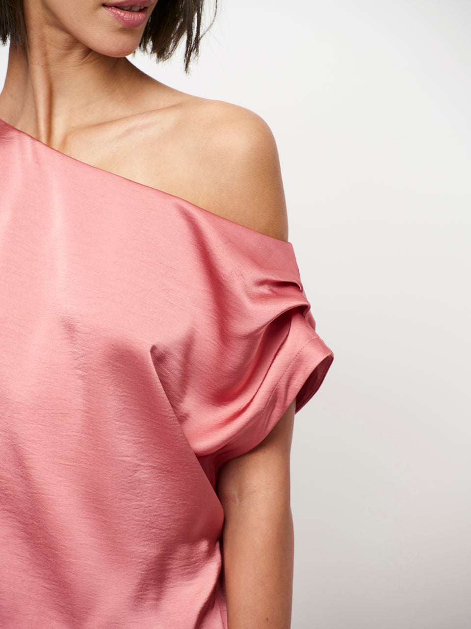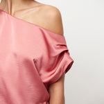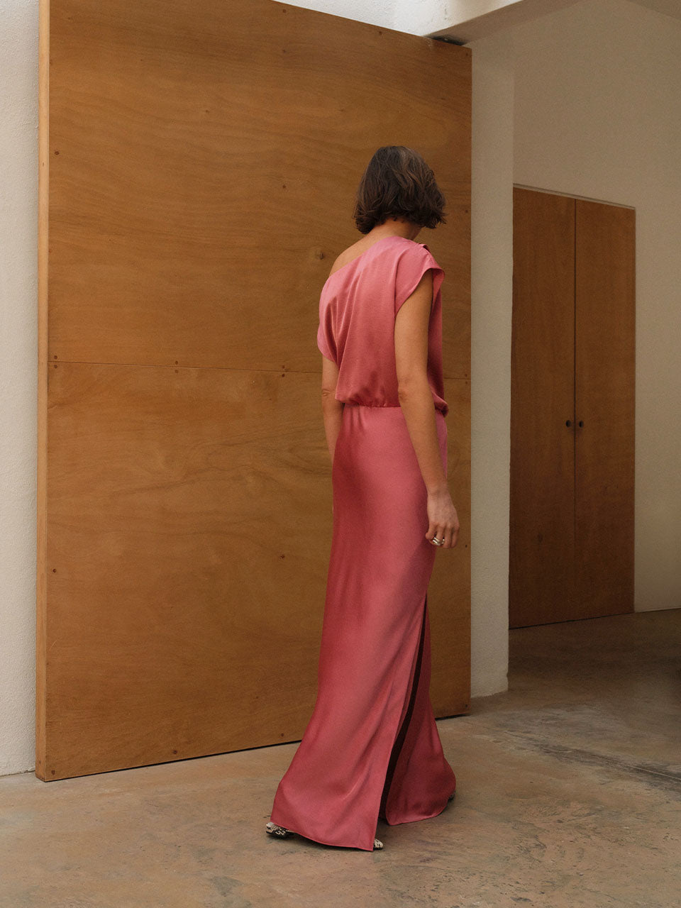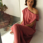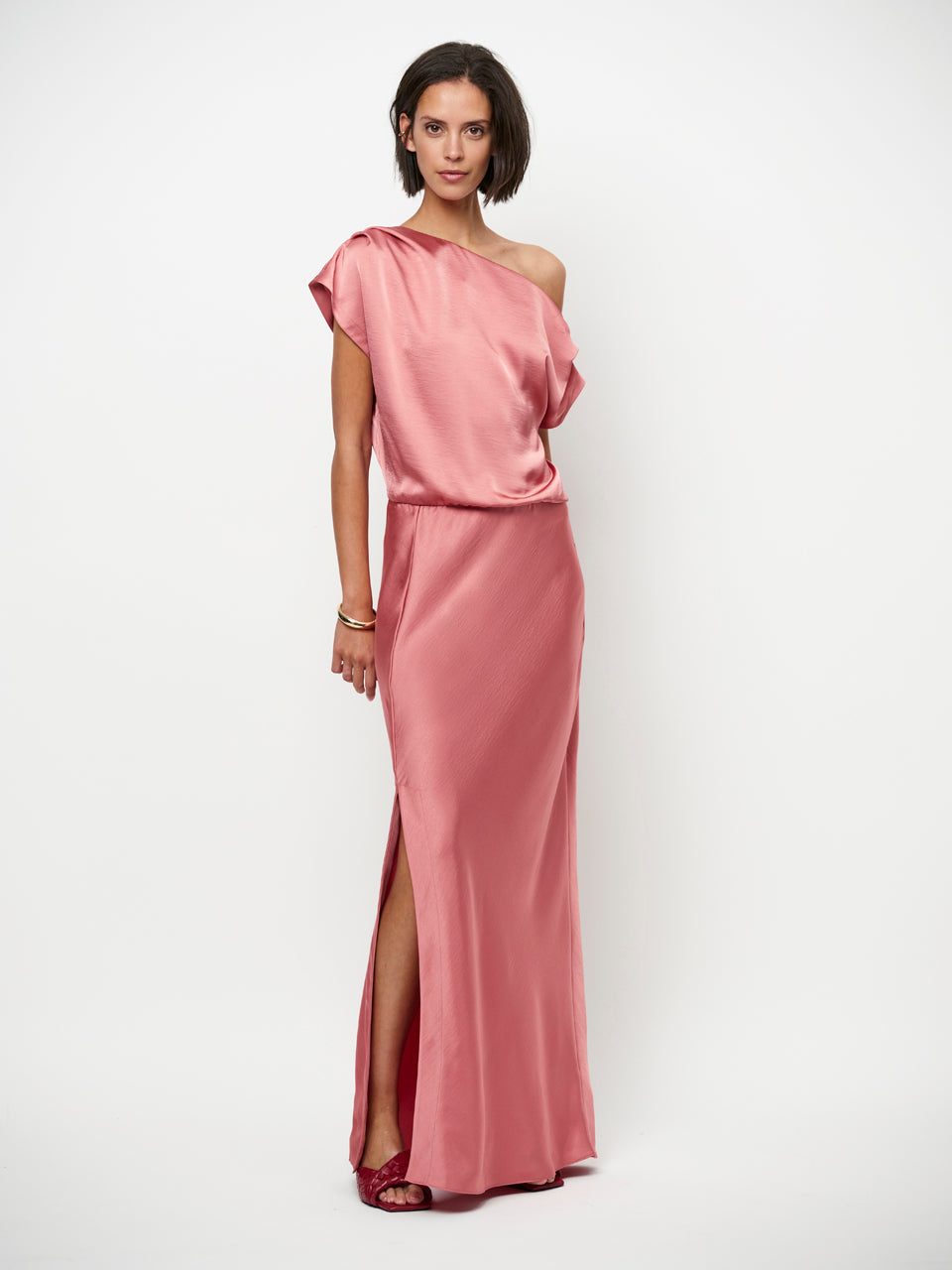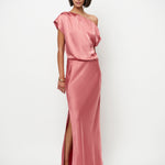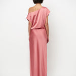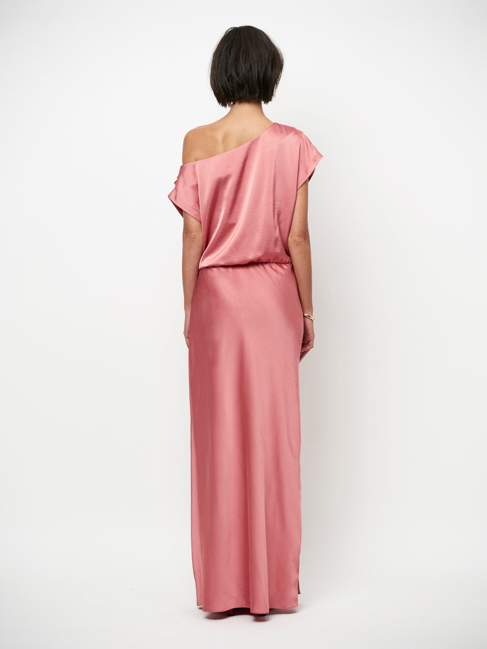 Epic-kjolen i Coral Blush udstråler moderne elegance med en flydende silhuet og et blødt, lysende finish. Den har en asymmetrisk halsudskæring, der falder ned over den ene skulder. En diskret elastisk linning bagpå sikrer en behagelig pasform.