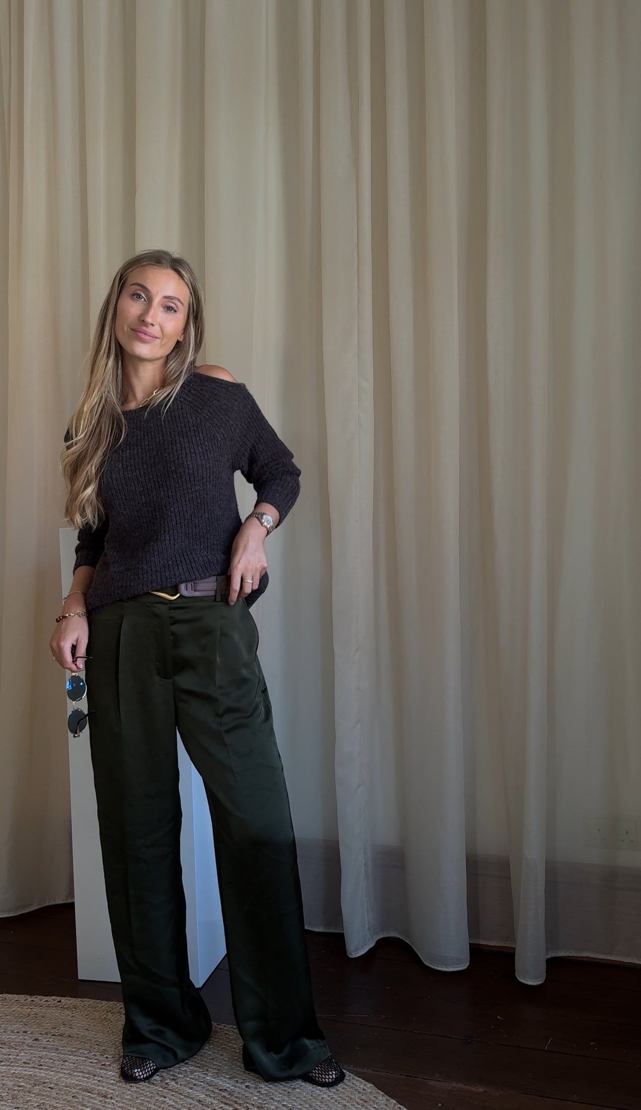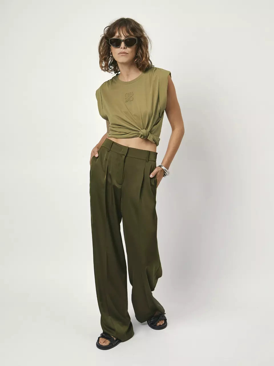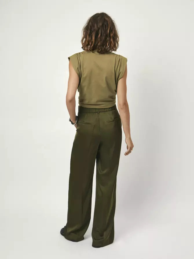 Til dit næste luksuriøse outfit, vælg vores bukser Jules i satin. Disse komfortable, lige og brede benbukser har elastik i det bageste taljebånd og sidelommer.