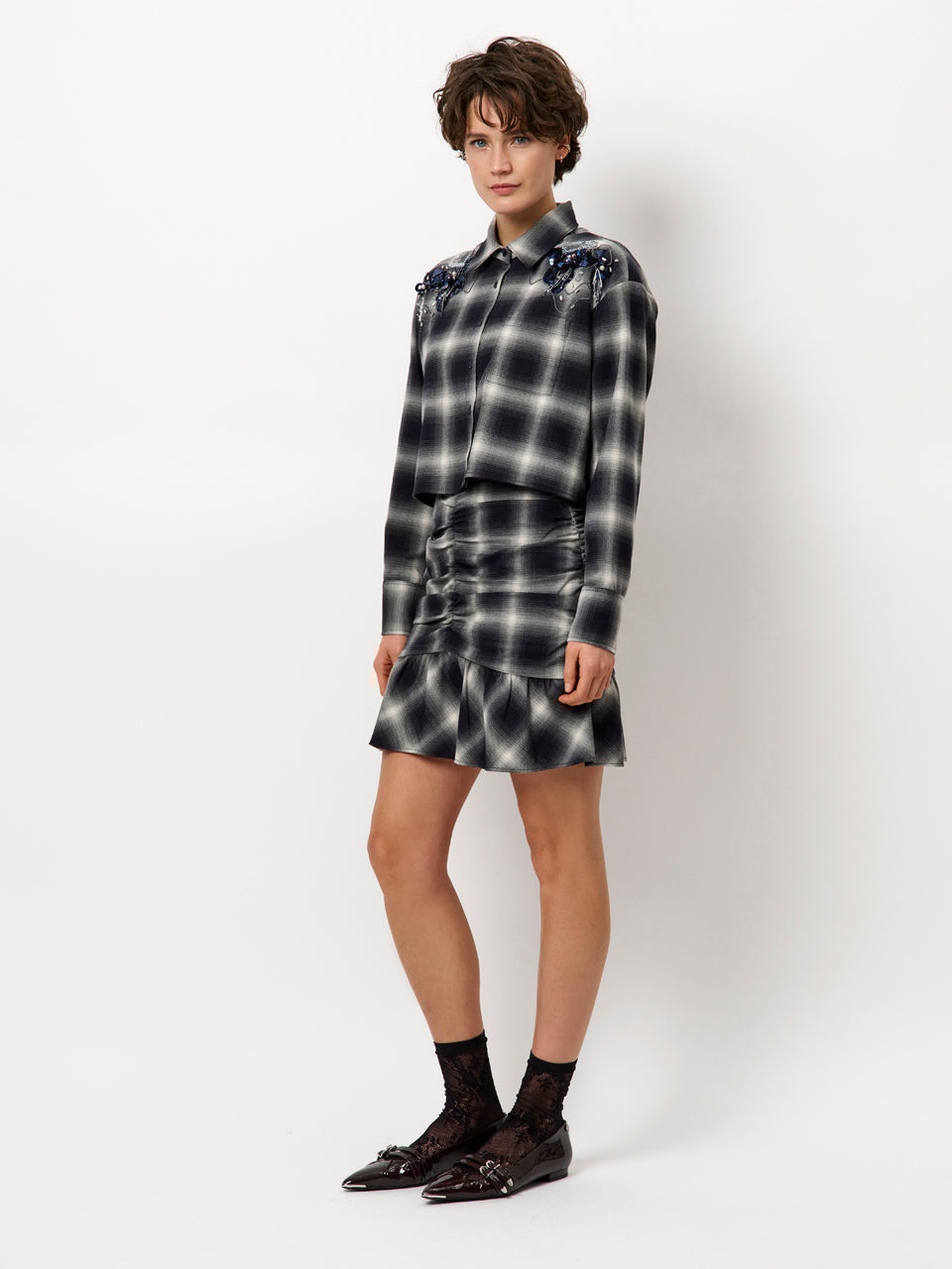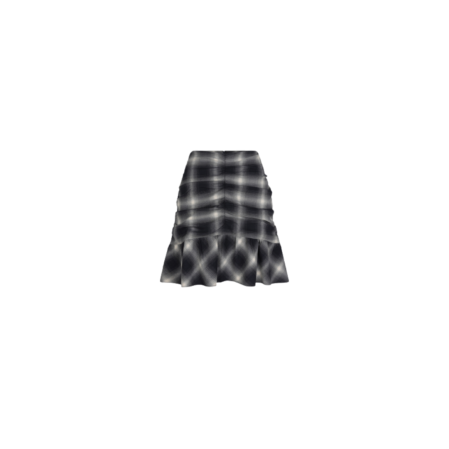 En sød og stilfuld nederdel med tern, rynker og flæsekant. Let at style, super behagelig og blød at have på.
