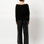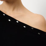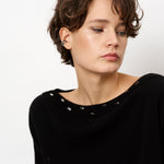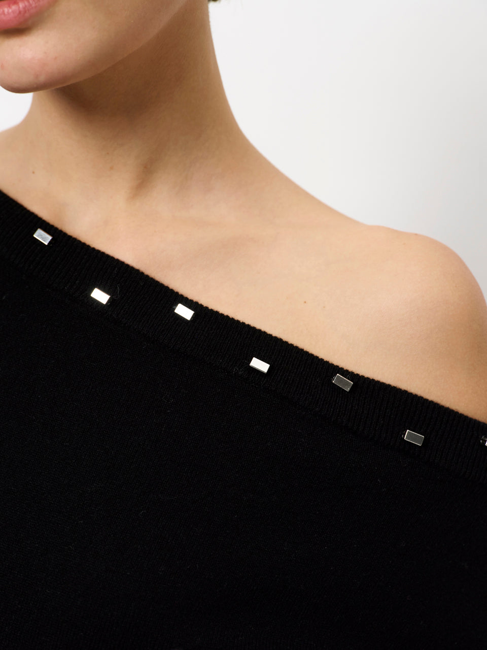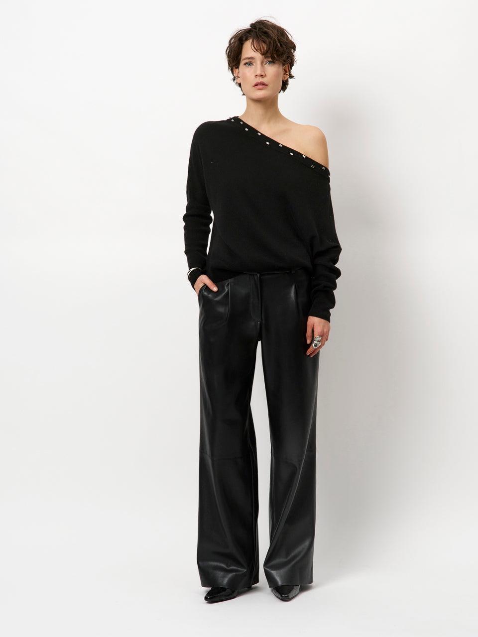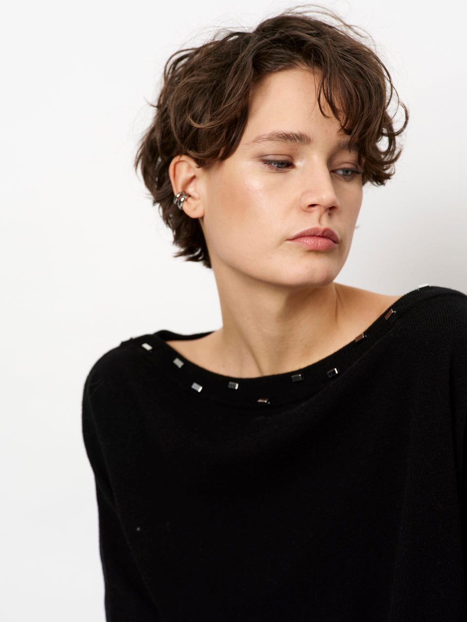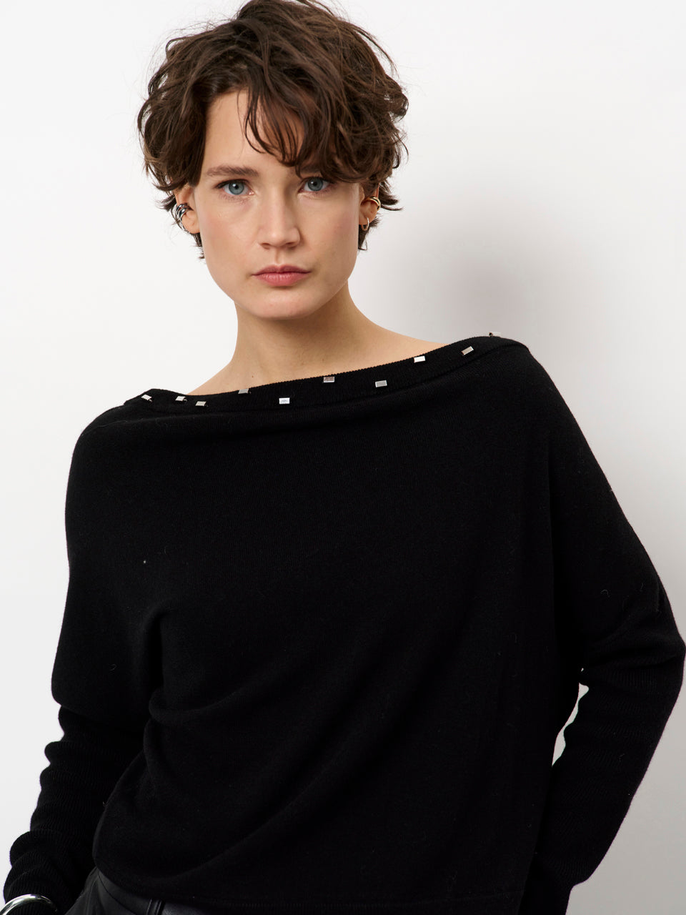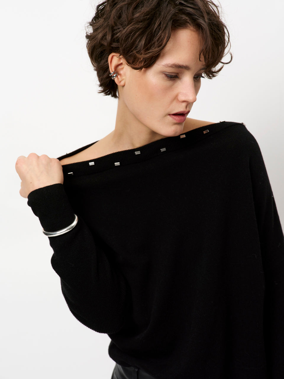 Mayu-trøjen i luksuriøs uld- og cashmereblanding. Den har en løs pasform med brede ærmer og kan bæres off-shoulder. Nitter langs udskæringen giver et unikt og stilrent udtryk.
