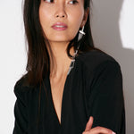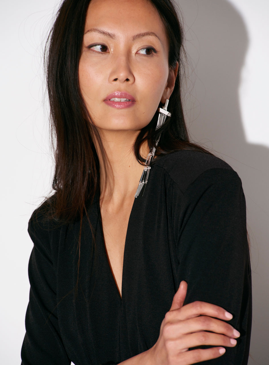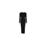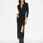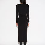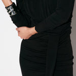 Roany-kjolen i sort er tætsiddende og feminin. Den har en dyb V-hals, rynkede detaljer i taljen og en slids foran.