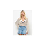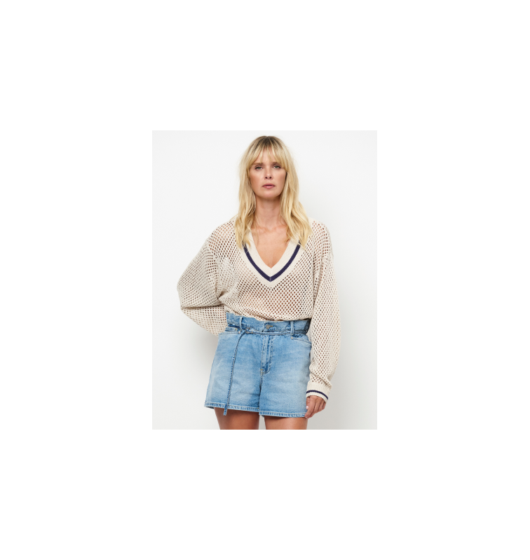 Volcy-pullover i Porcelain Beige – afslappet og elegant med retro-inspirerede detaljer. Let viscoseblanding med subtil lurex, åben strik og V-udskæring med kontraststriber. Ribkanter og cropped pasform gør den perfekt til lag-på-lag.