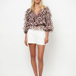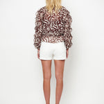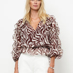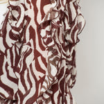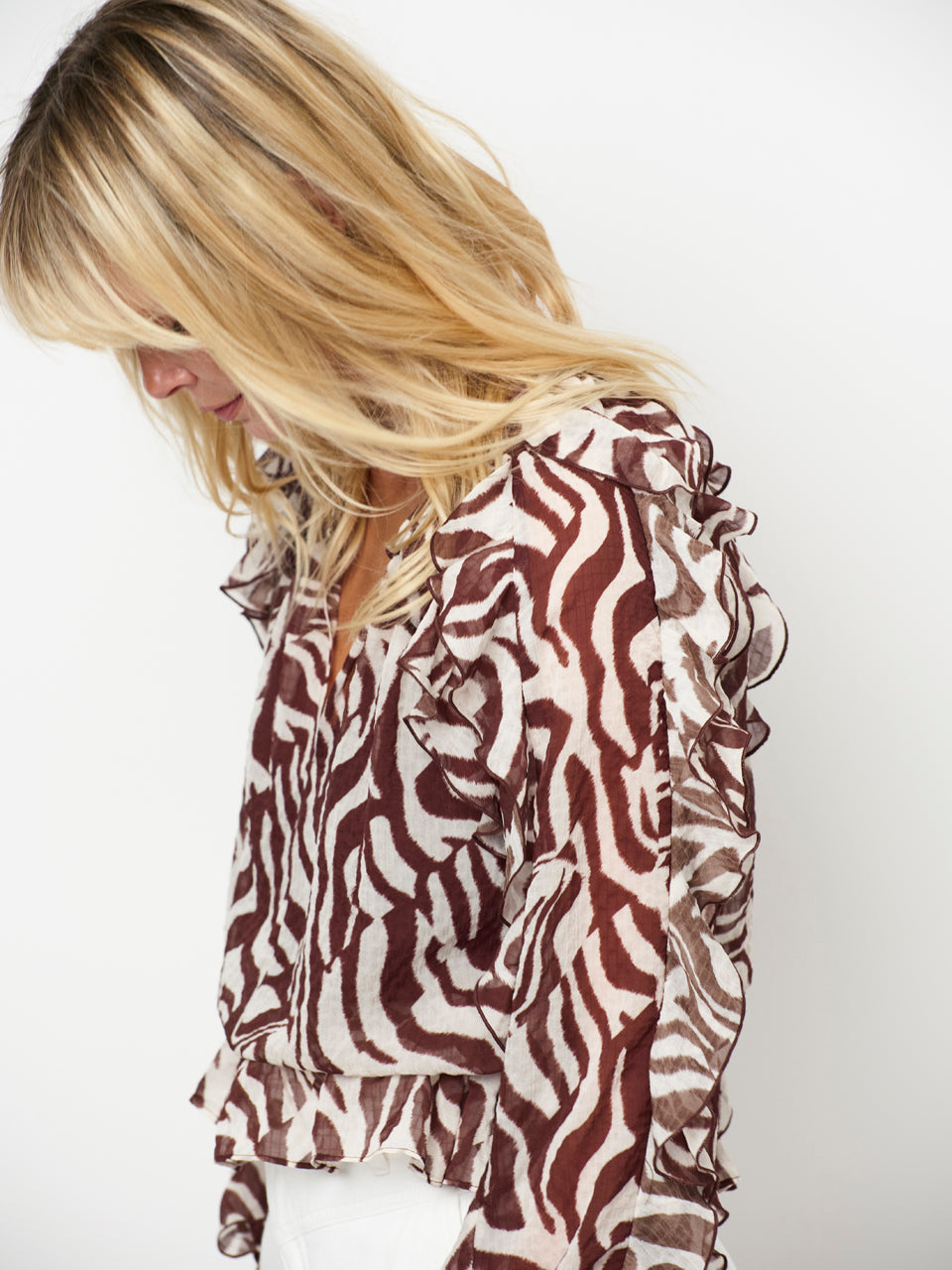 Let, luftig og fuld af bevægelse. Har et dristigt zebra-inspireret print samt bløde flæsedetaljer ved ærmer og forneden. Det transparente stof skaber en svævende silhuet, mens det separate for i toppen sikrer behagelig dækning. Den dybe V-udskæring giver et feminint touch.