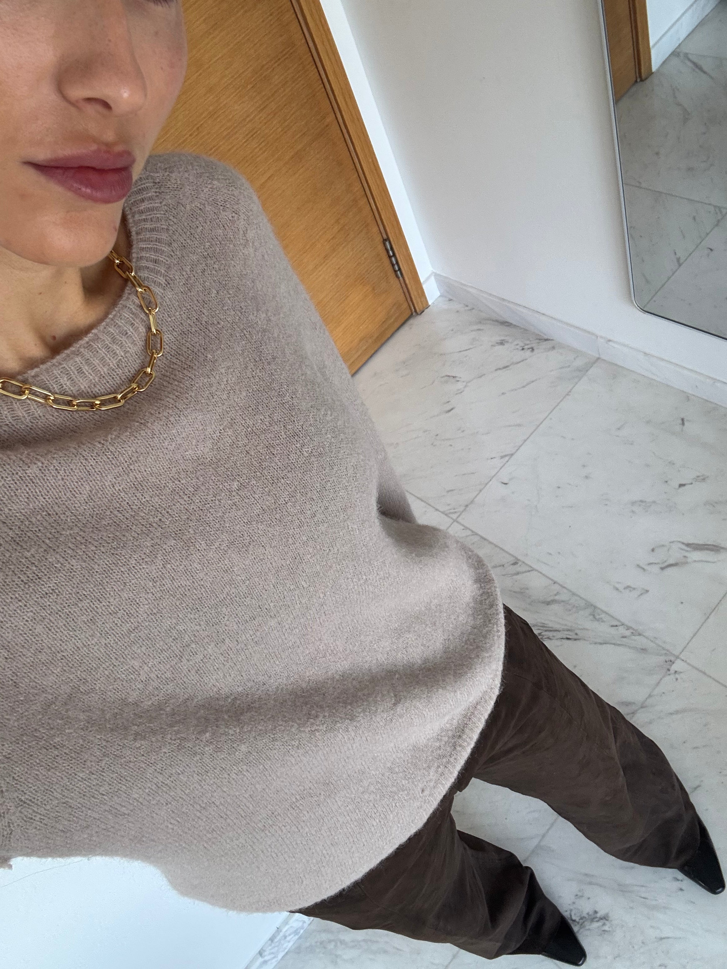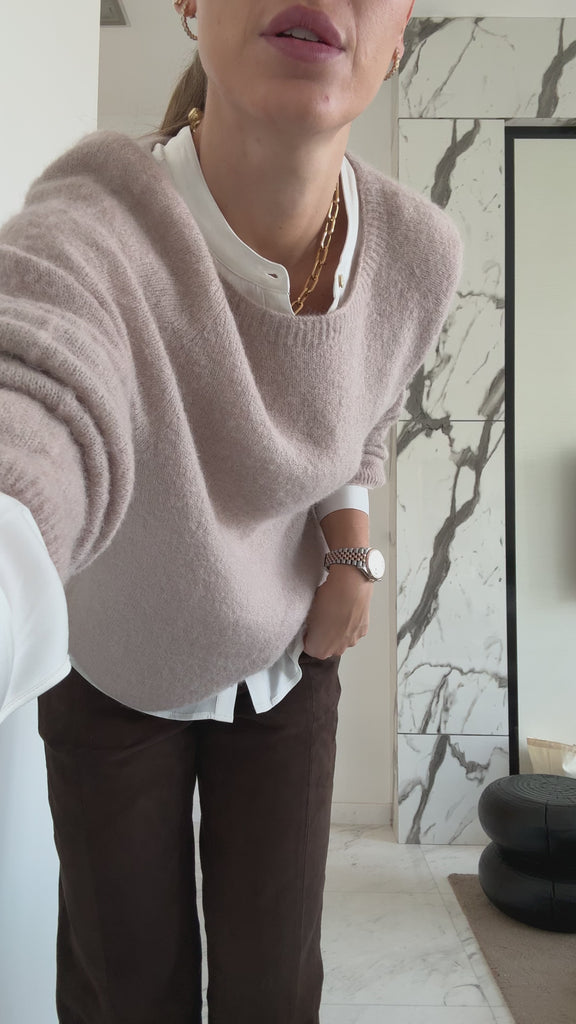 Det bløde materiale med 30 % babyalpaka gør den både let og lun, og den føles virkelig behagelig mod huden.