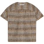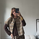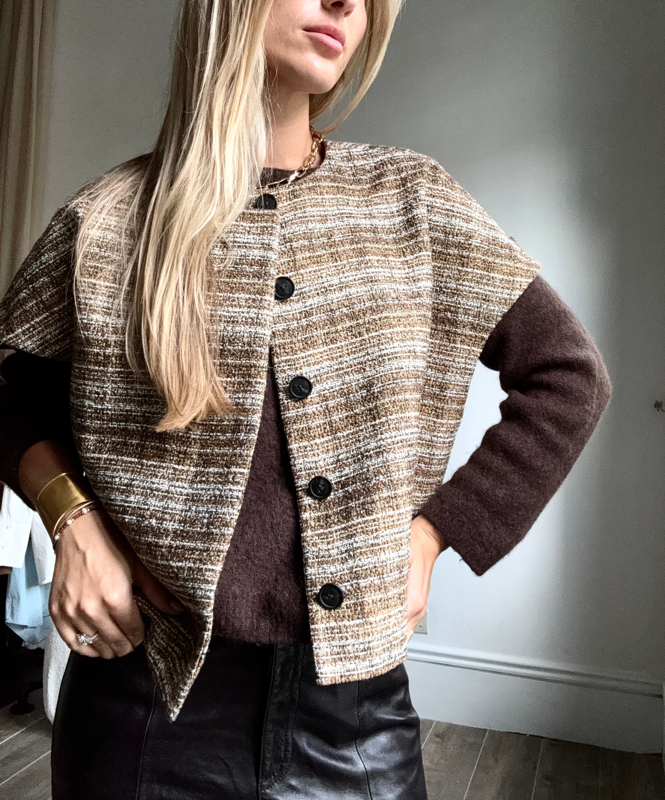 Besea cape er en kort, boxy cape med afrundet skulderlinje, skjult lukning og let vævet struktur med grafisk stribet effekt.