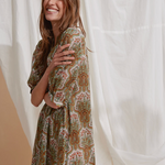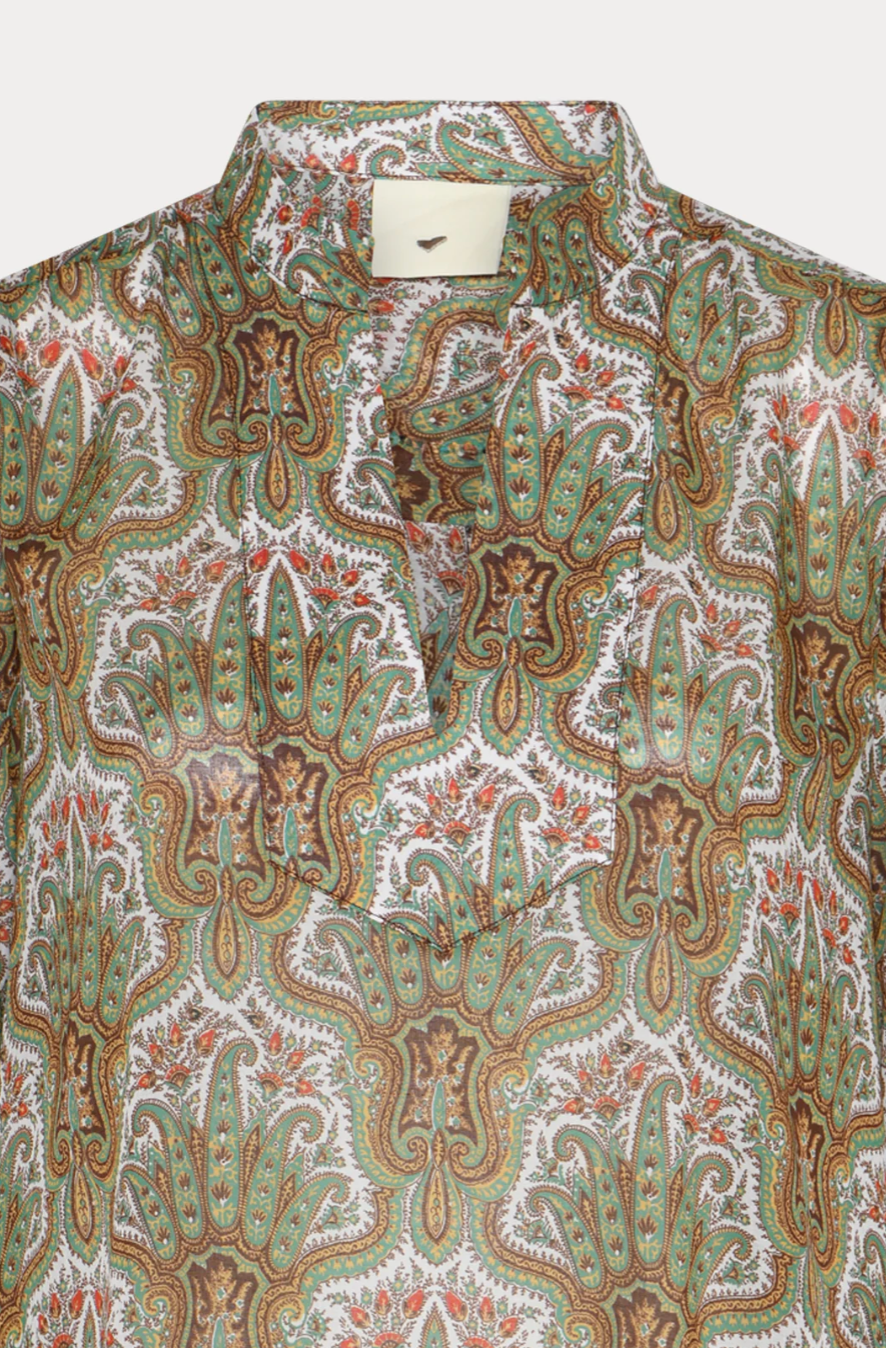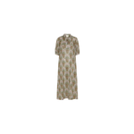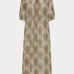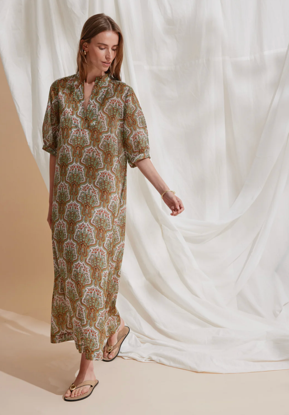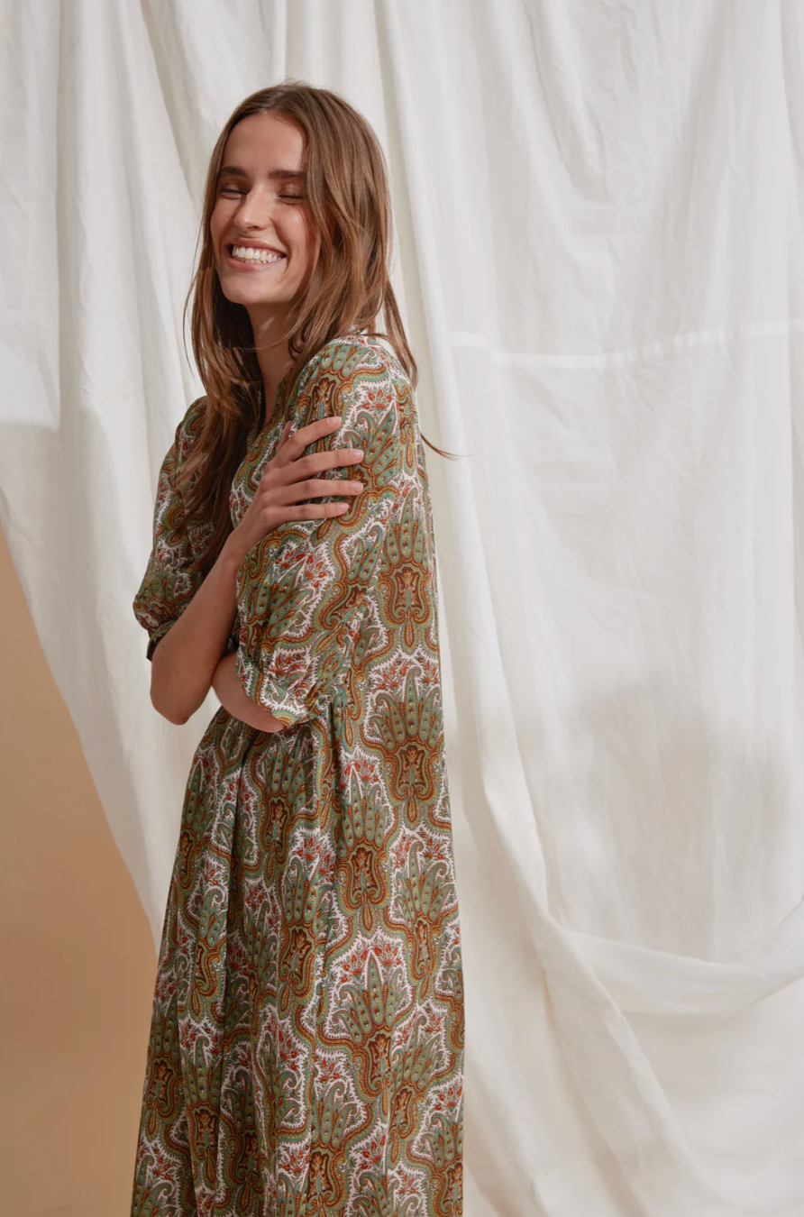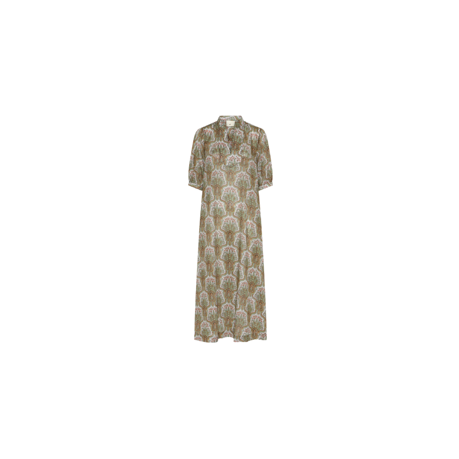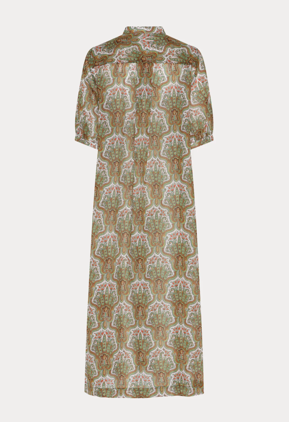 Heliva er en lang, let kjole med løs silhuet, kort ærme og en blød ståkrave, hvor det paisleyinspirerede print giver et roligt, flydende udtryk.