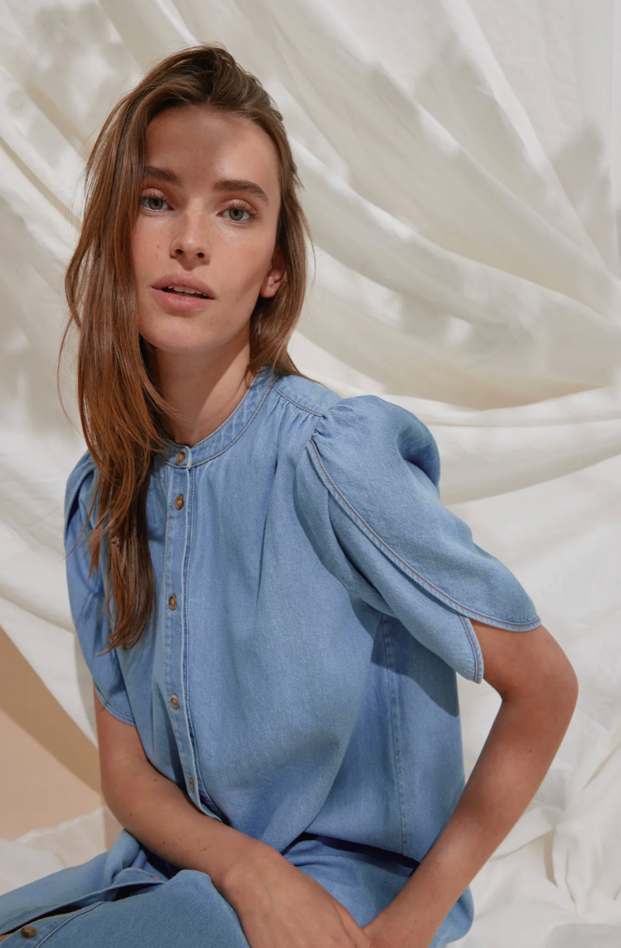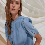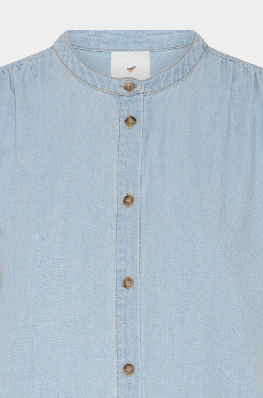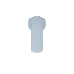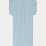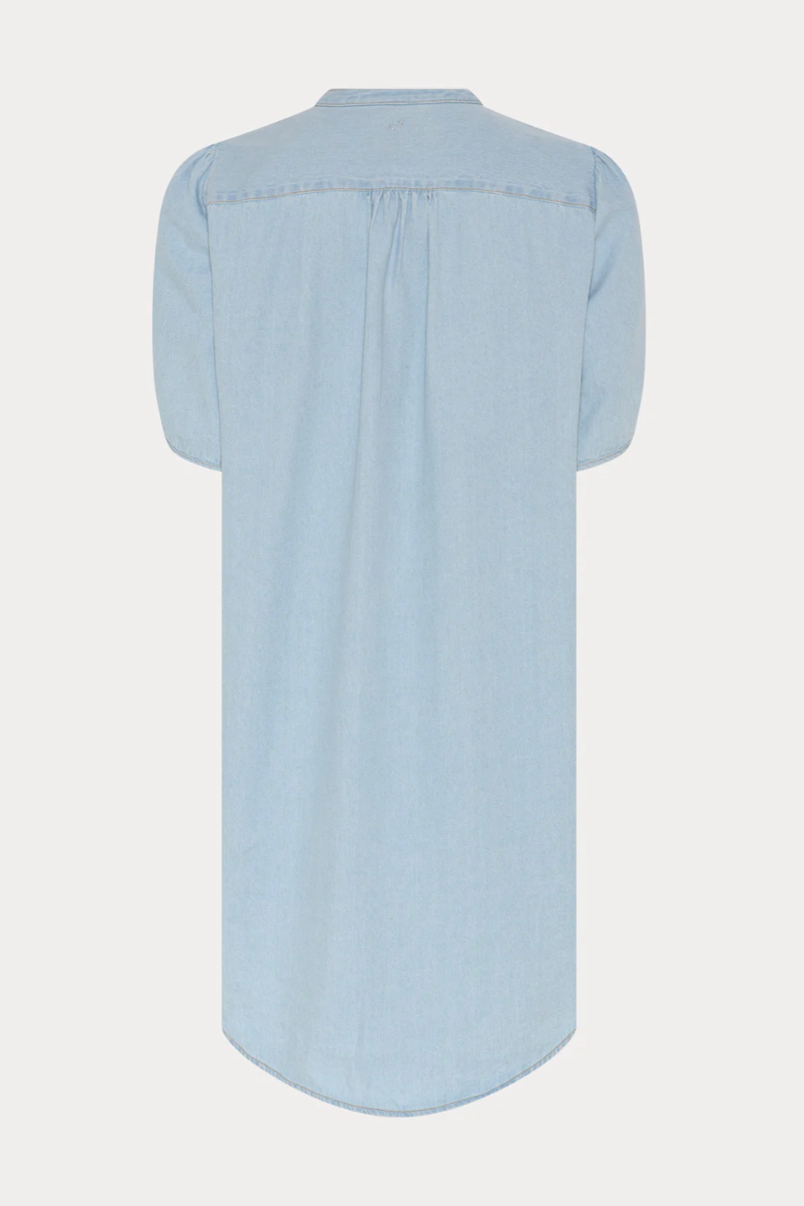 Herle kjole er en lige, knælang denimkjole med stående krave, afrundede skuldre og korte pufærmer, der giver et blødt, struktureret udtryk.