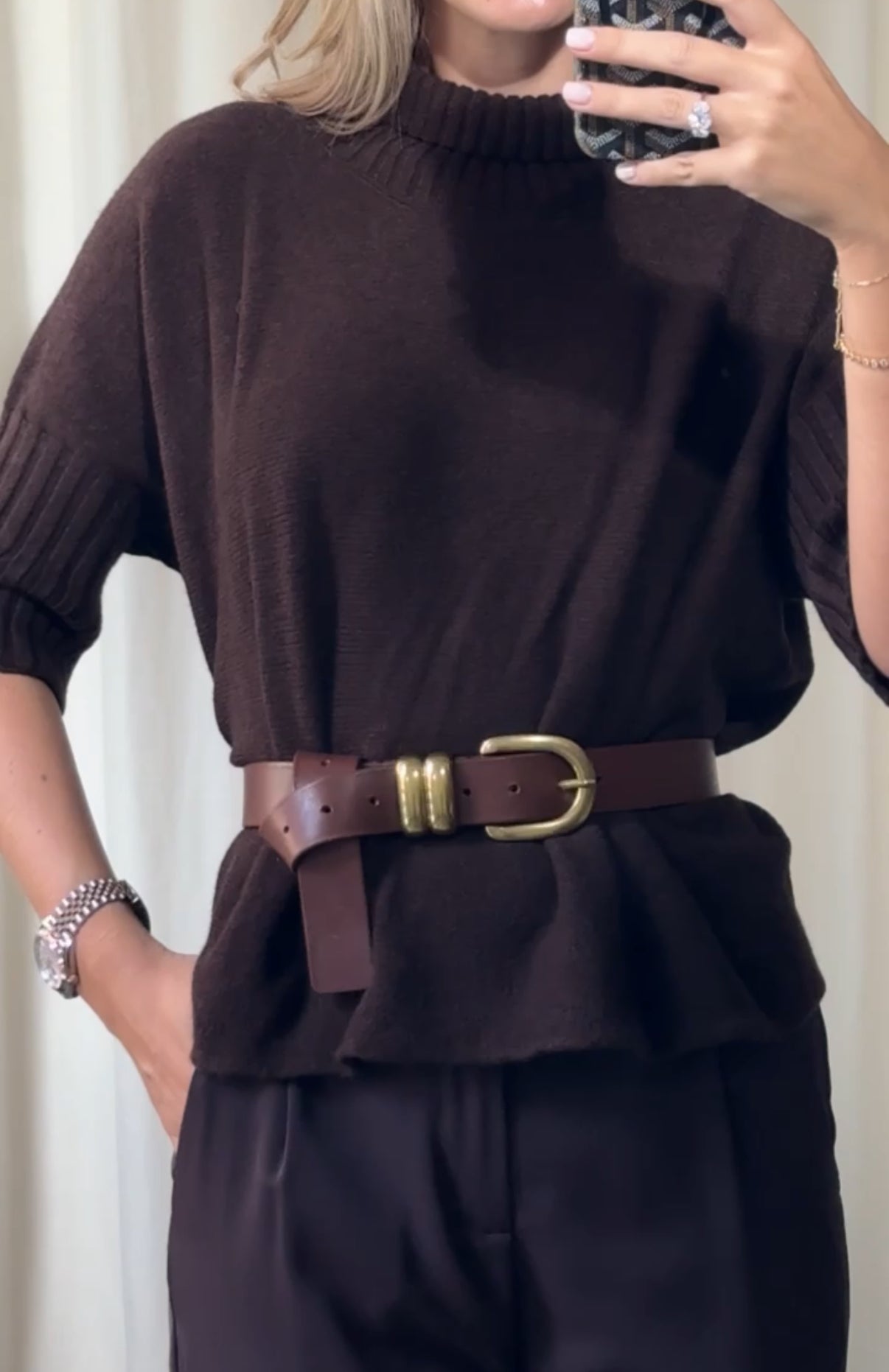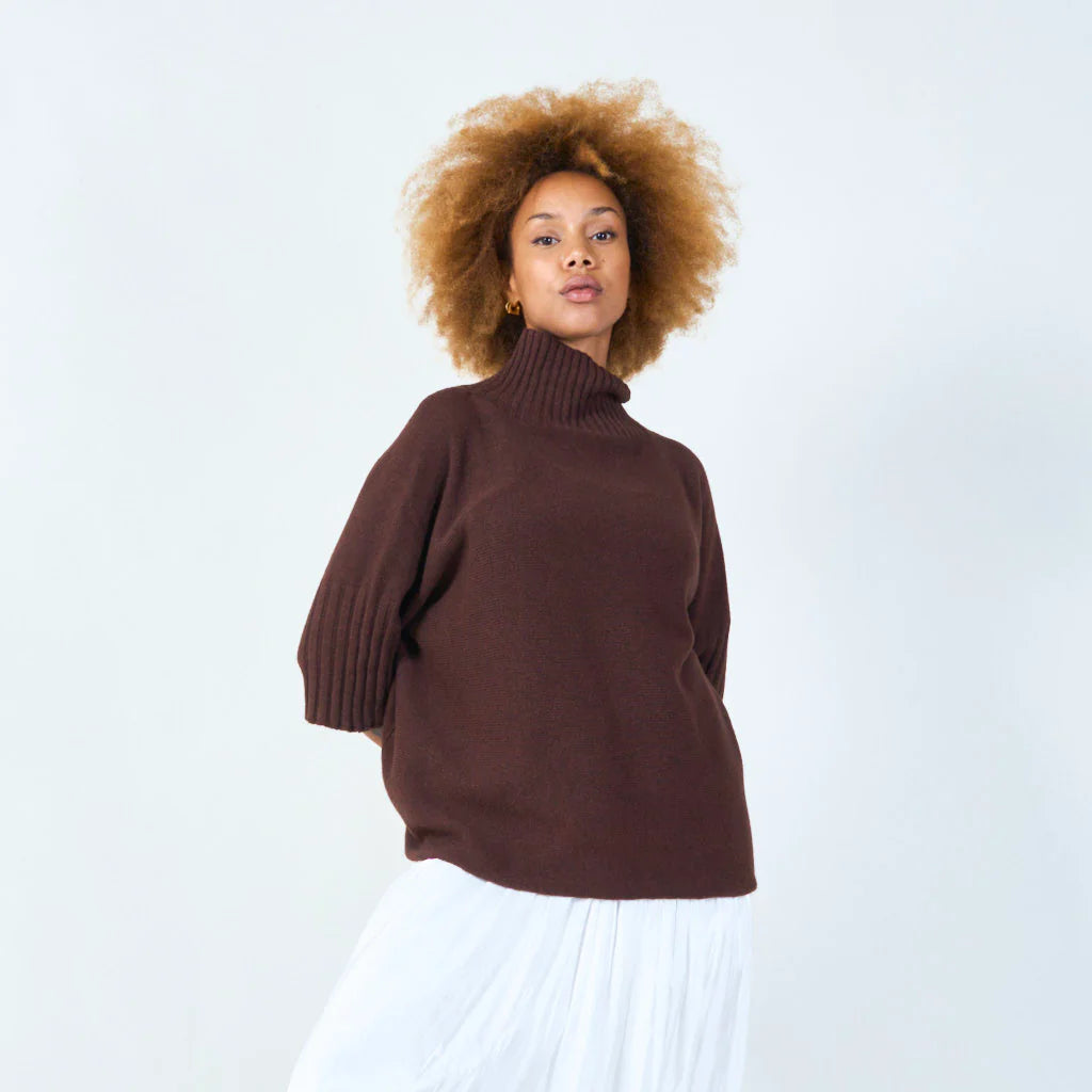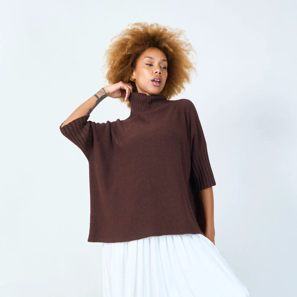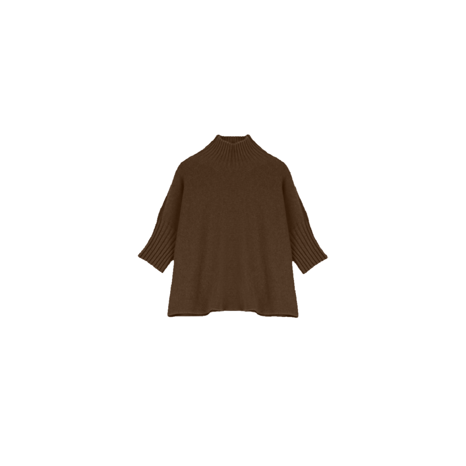 Skøn strikbluse med 3/4-ærmer og en afslappet pasform. Den har en lille, stående krave med ribkant, og ærmerne er afsluttet med en bred ribkant, hvilket skaber en flot detalje. Den let cropped længde tilføjer et cool touch til dit outfit.