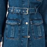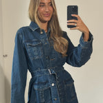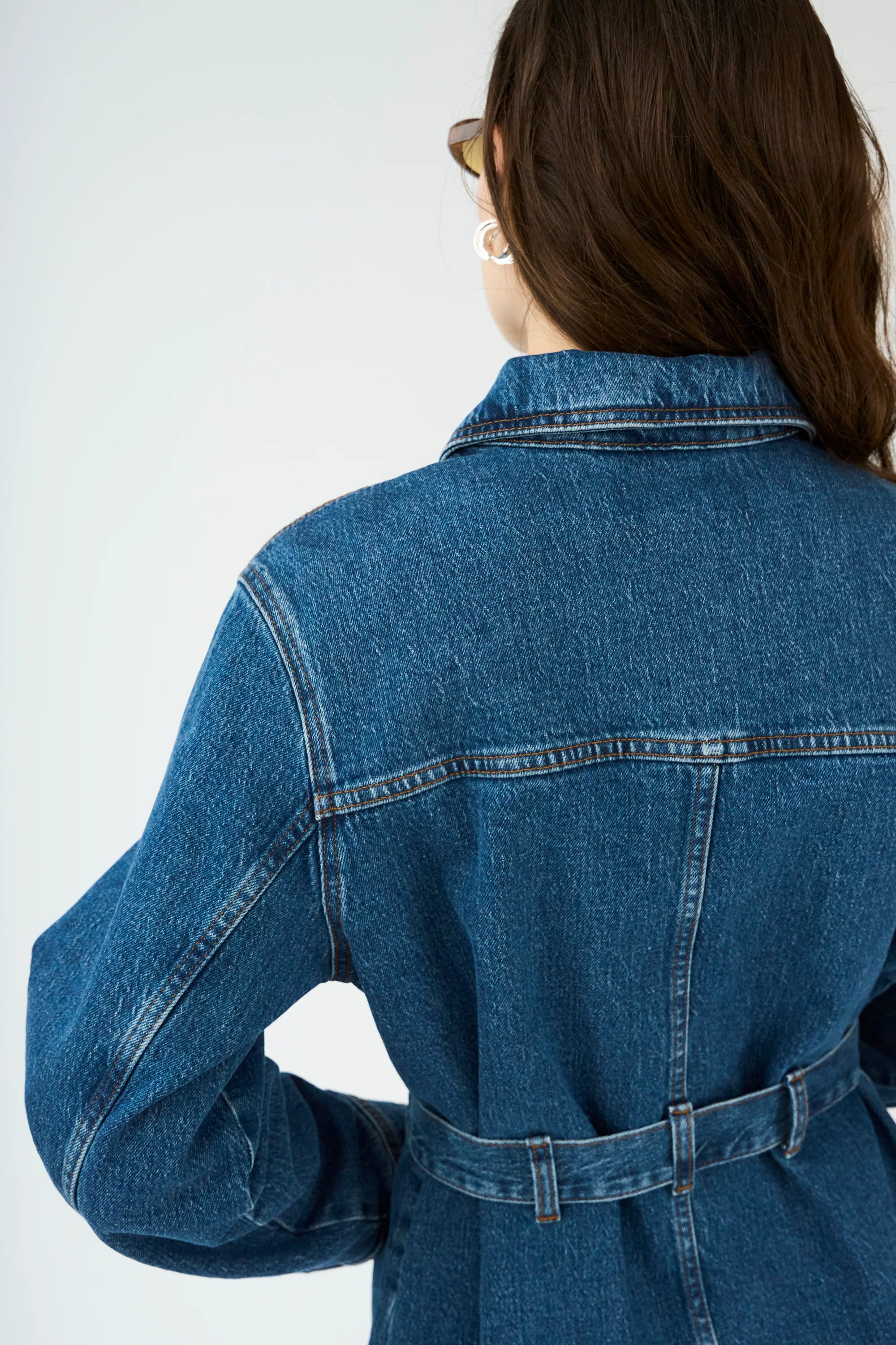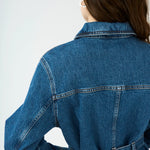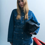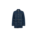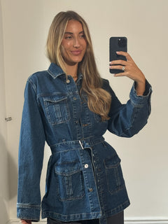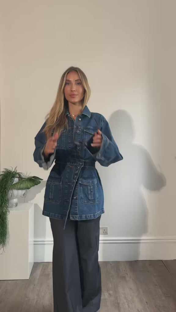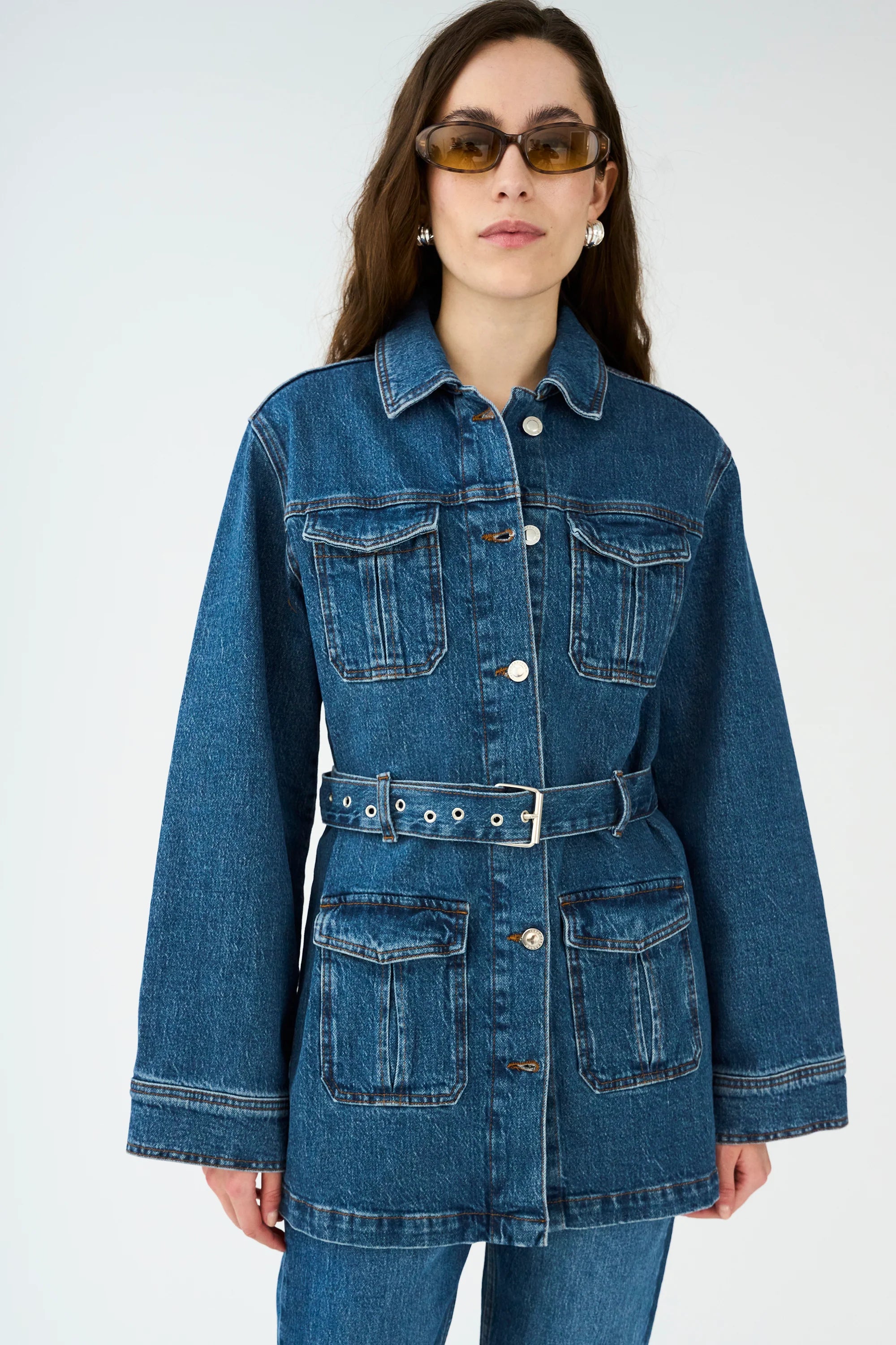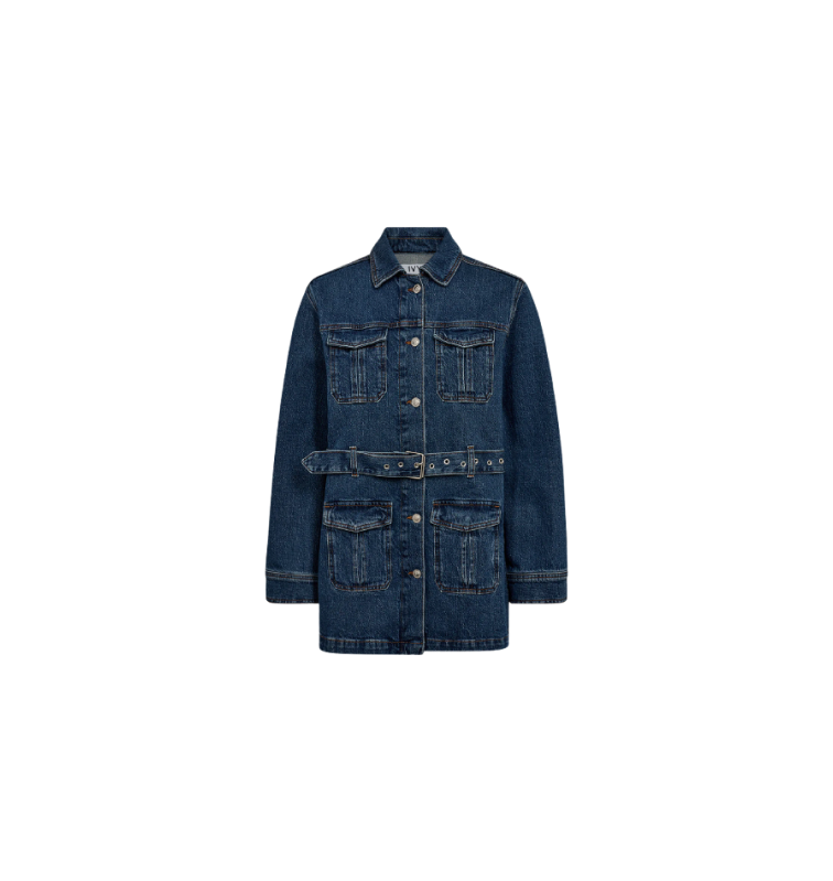 Workwear-inspireret denim med fire lommer og justerbart taljebælte.