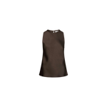 Top i satin. Toppen er ærmeløs, har en rund halsudskæring og lukkes med en dekorativ knap i nakken. Den er designet med et figursyet snit og har en almindelig pasform. Modellen er iført størrelse 36.