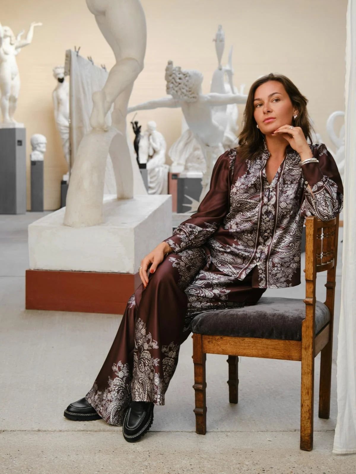 Elegante bukser i en blød satinkvalitet med et smukt, farverigt paisleymønster. De har en behagelig elastisk talje og brede ben, som giver et feminint og let udtryk. Perfekte både til hverdag og til lidt pænere lejligheder.