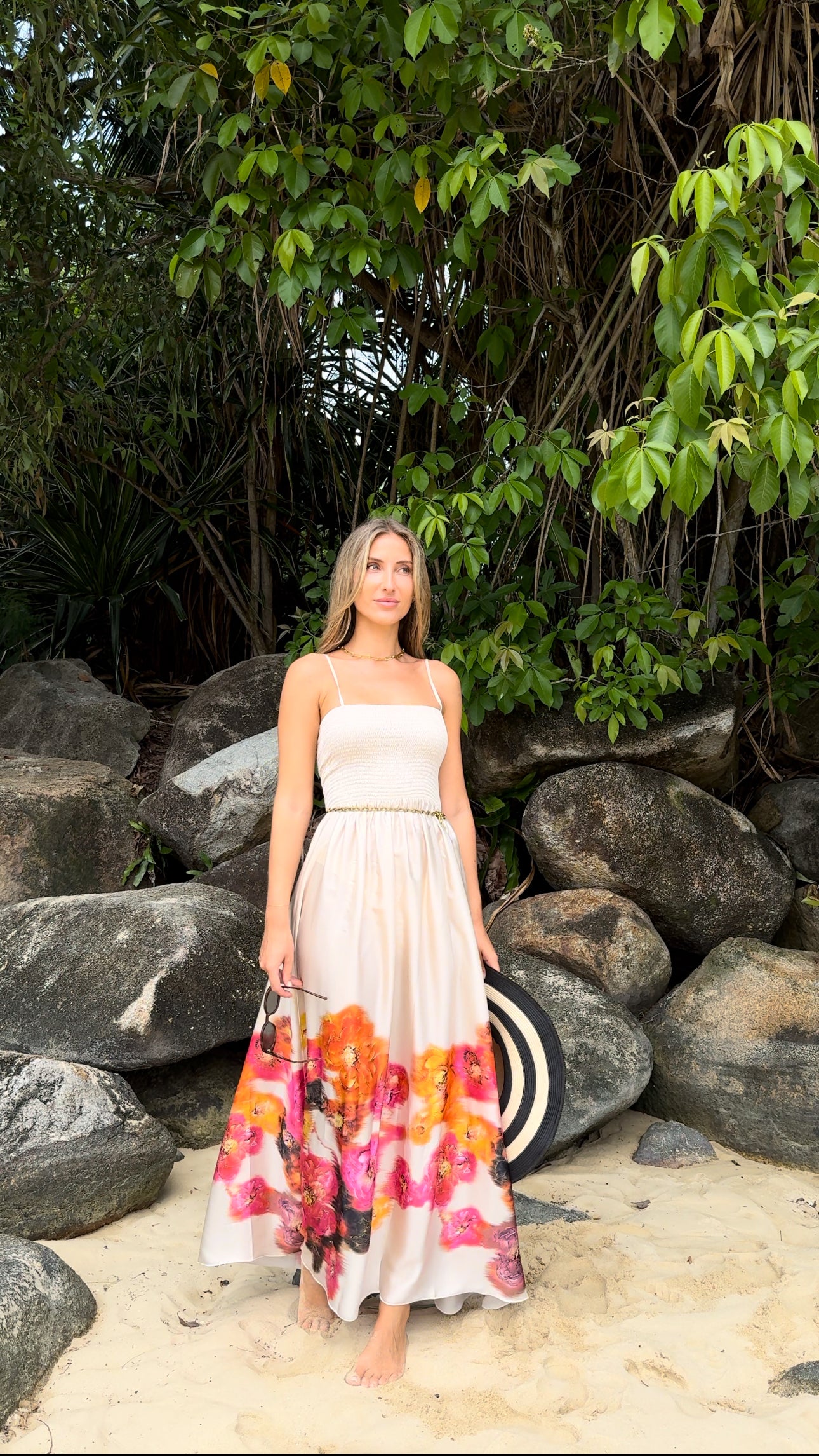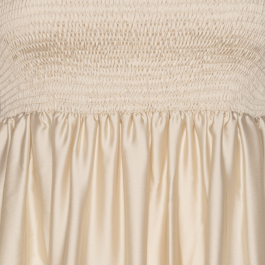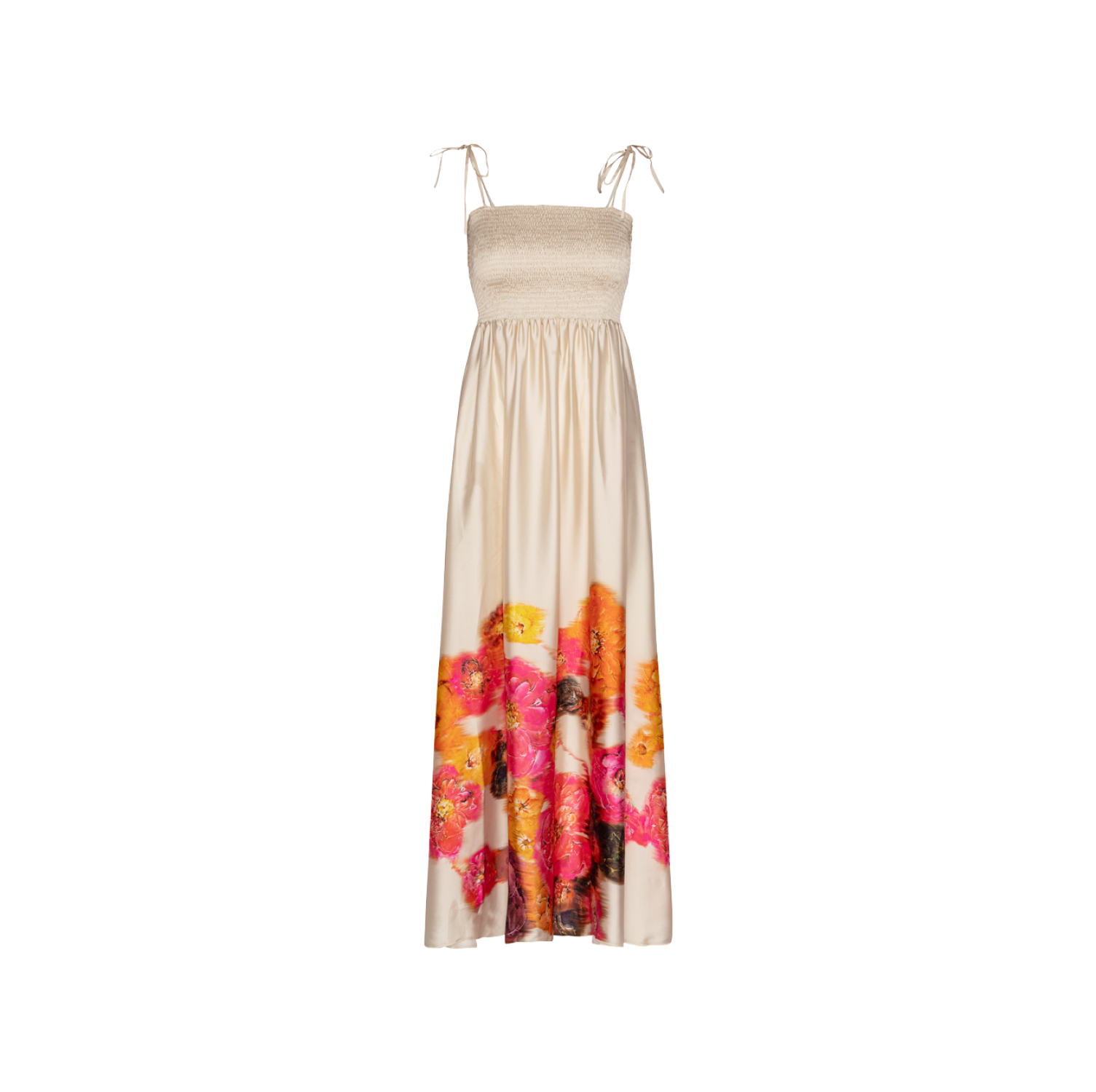 Smuk maxi kjole med smock top, stropperne kan bindes på flere måder samt justeres.