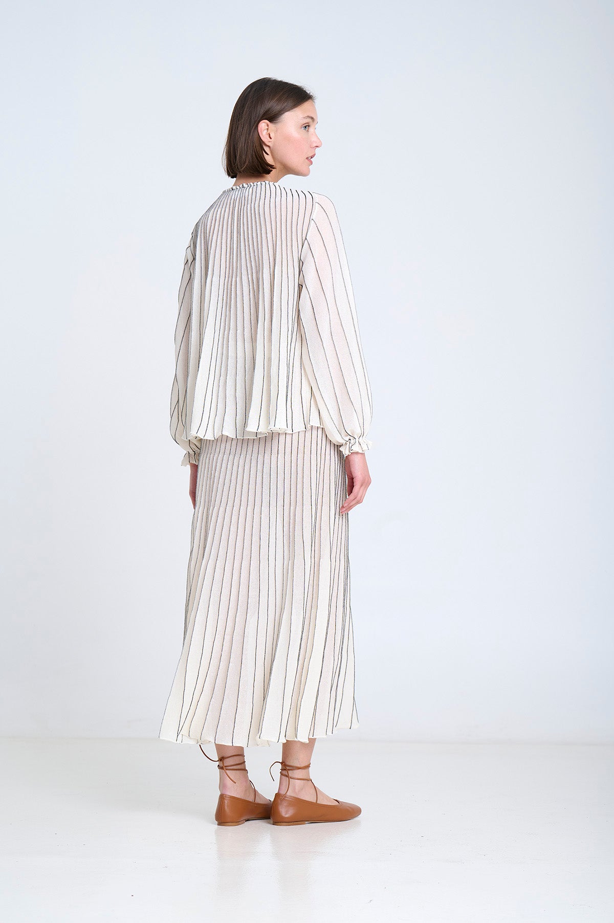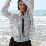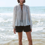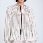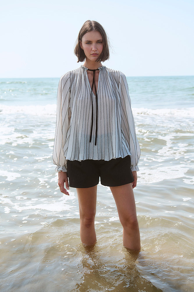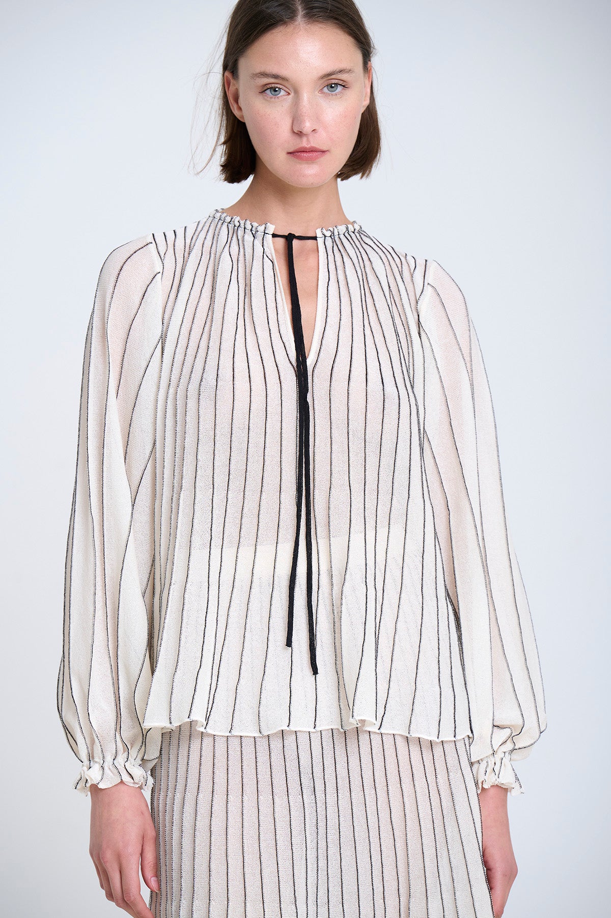 Stribet strikbluse, strikket med radialteknik. Pufærmer med elastiske manchetter. Fremstillet med FSC-certificeret italiensk garn.