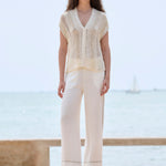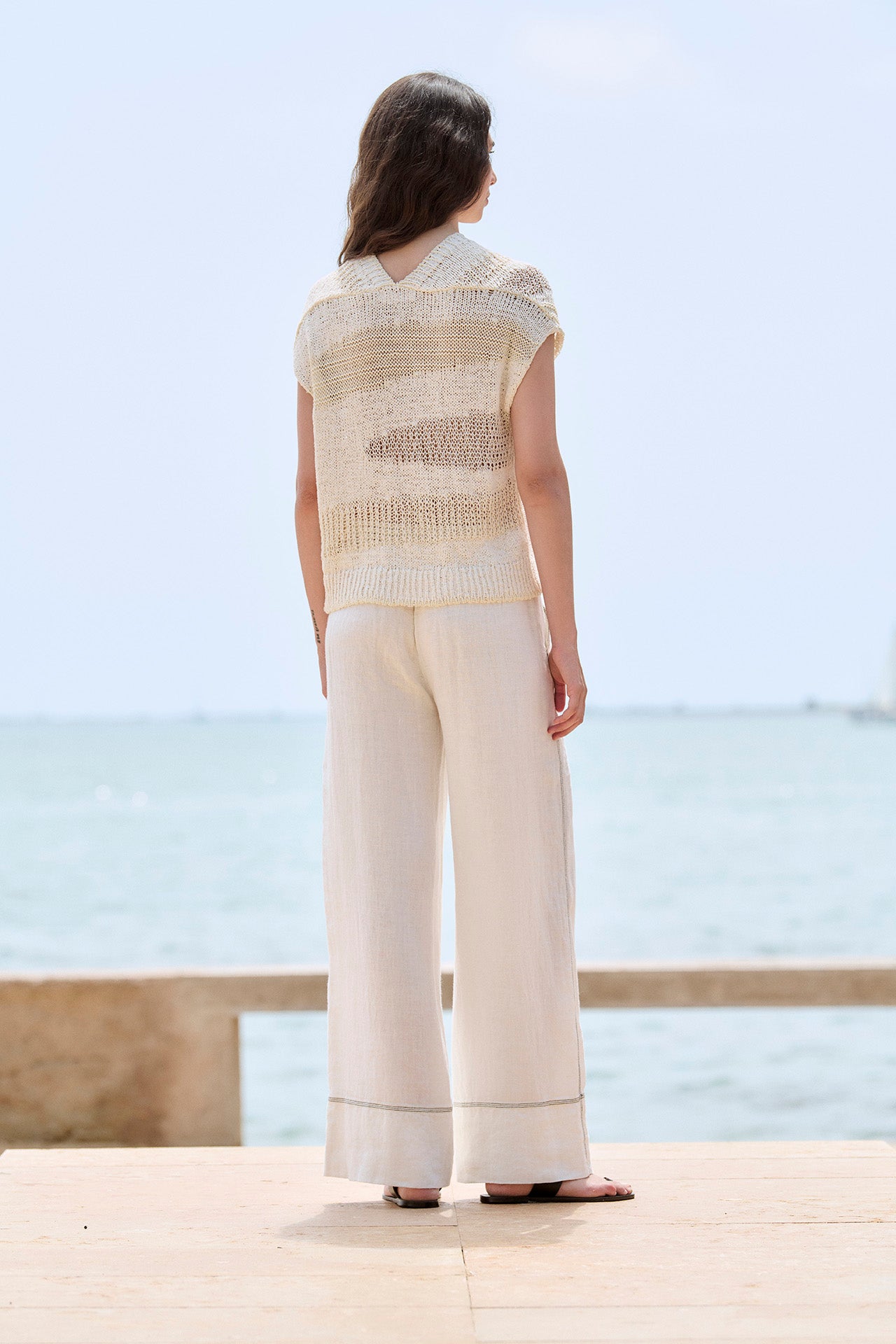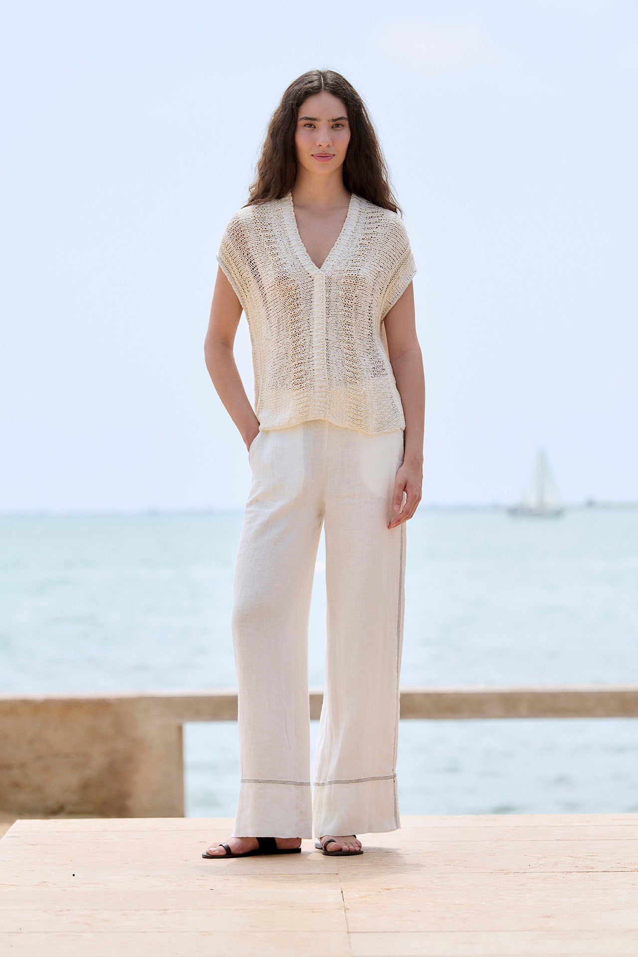 Ærmeløs sweater i rustik strik med en kombination af forskellige garner. Ribkant og V-halsudskæring. Oversized pasform. Strikket i Igualada med italiensk garn.