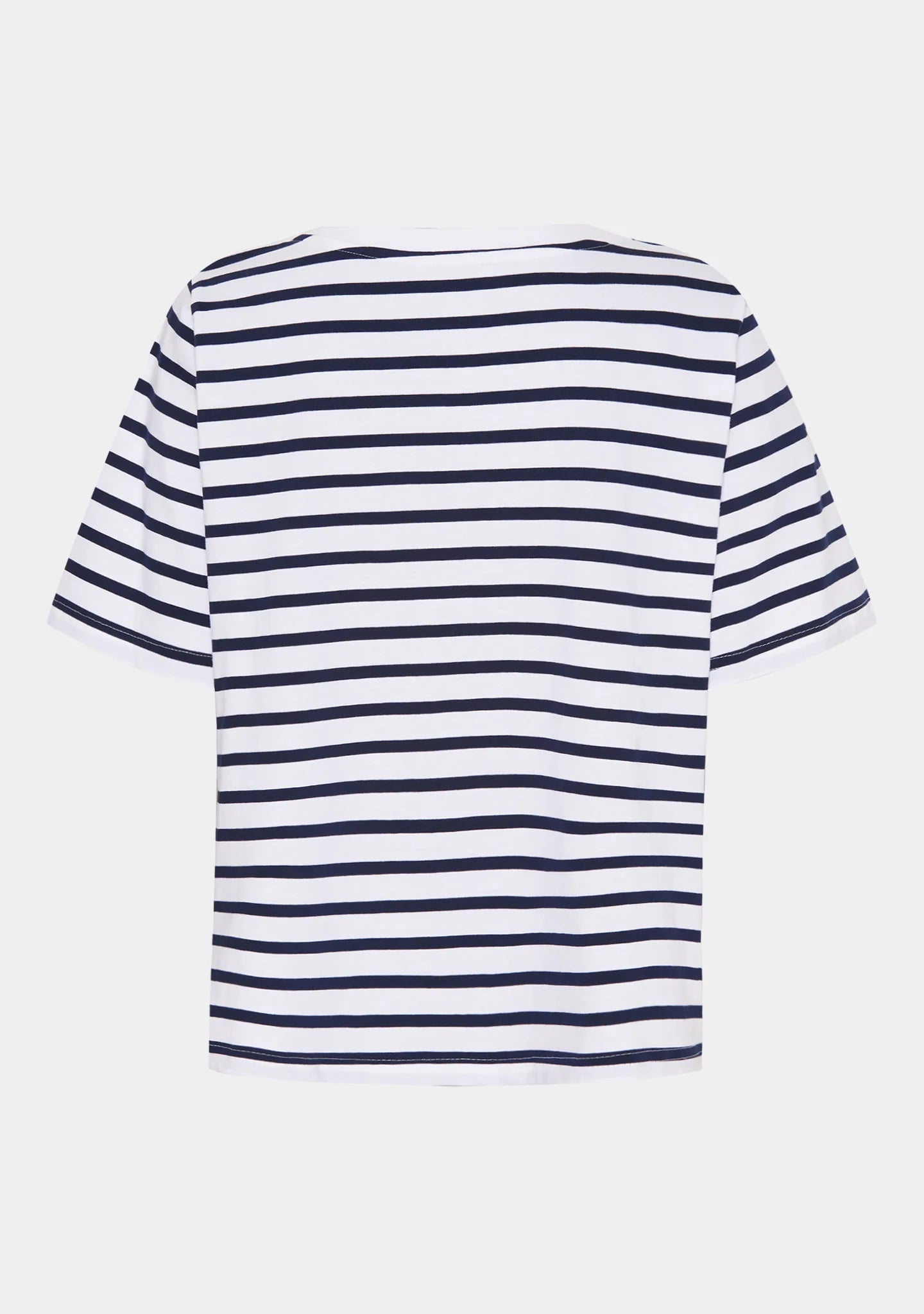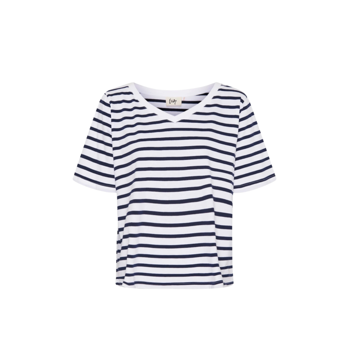Cool t-shirt i et stribet print. T-shirten har korte ærmer med v-hals i en almindelig pasform. Kvaliteten er blød bomuld, som giver god komfort. Brug den tidløse t-shirt året rundt.